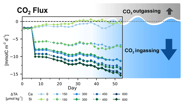 Ocean Alkalinity Enhancement (OAE) is an approach to sequester atmospheric CO2 in the ocean and may alleviate ocean acidification. A large-scale mesocosm experiment in Norway tested calcium- and silicate-based OAE, increasing total alkalinity (TA) by 0–600 µmol kg-1 and measuring CO2 gas exchange. While TA remained stable, we found mineral-type and/or pCO2/pH effects on coccolithophorid calcification, net community production and zooplankton respiration, providing insights for future OAE trials.