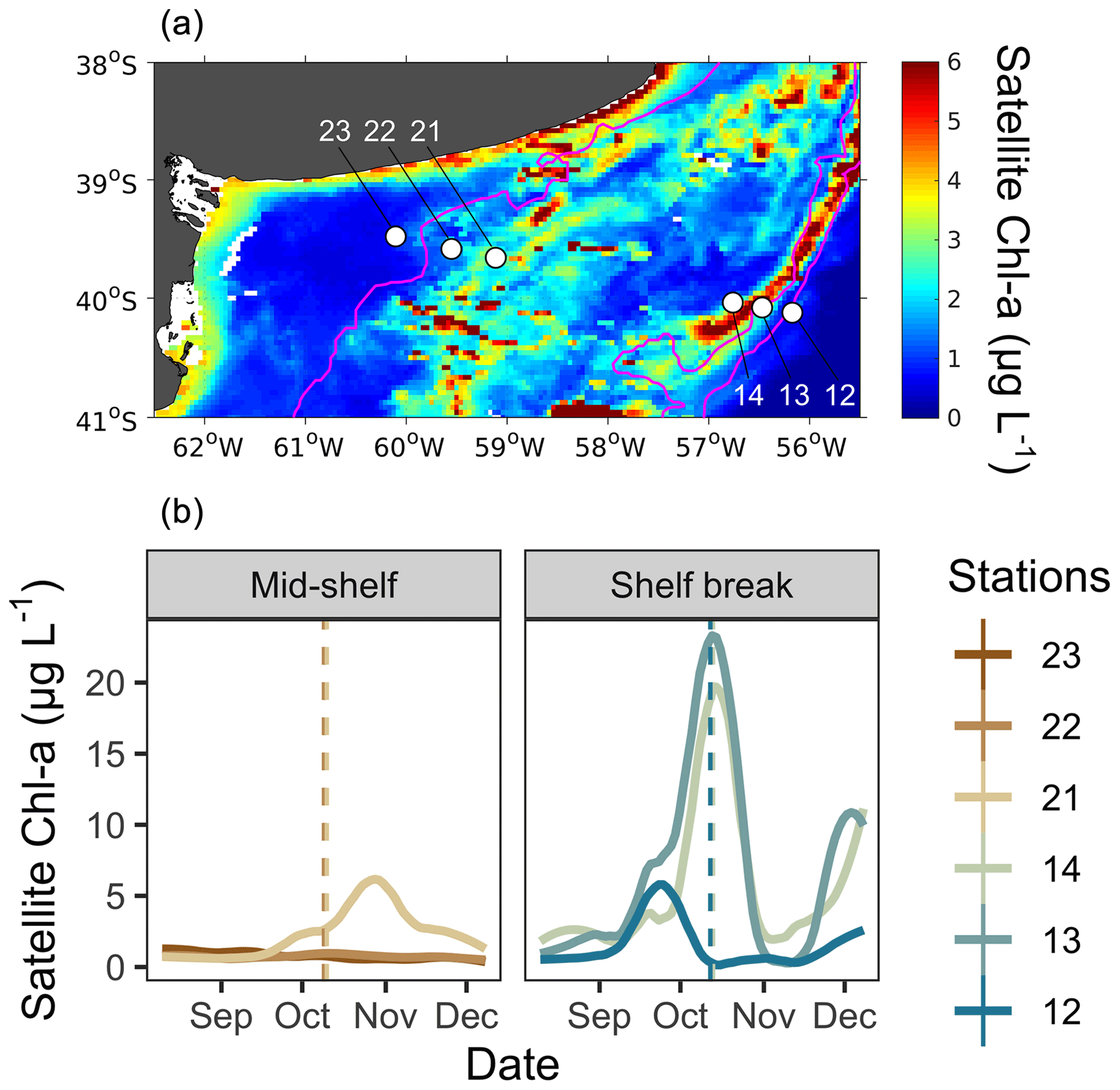 Figure 1(a) Map of the study site showing the locations of sampling stations (white dots) and the mean surface distribution of satellite chlorophyll a (Chl a) during the sampling period (9–12 October). Stations 23, 22, and 21 were located in the mid-shelf area, and stations 14, 13, and 12 were located in the shelf break front. (b) Temporal evolution of surface satellite Chl a concentration at grid points closest to sampling stations in the mid-shelf and in the shelf break front. Solid lines denote satellite Chl a concentration at each station, while dashed lines represent the date of in situ sampling. Lines are colour-coded according to the colours representing each station.