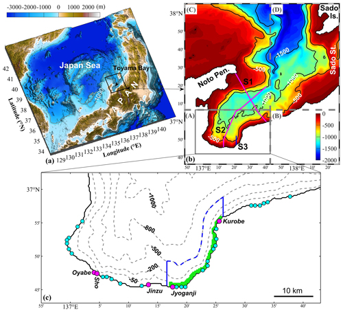 Figure 1(a) Study area. (b) Model domain for Toyama Bay. Colors and contour lines represent water depth, with units in meters. The model domain was divided into four areas from A to D with different horizontal resolutions. The respective horizontal resolutions are (A) 300 m × 300 m, (B) 900 m × 300 m, (C) 300 m × 900 m, and (D) 900 m × 900 m. “Pen.”, “Is.”, and “St.” are the abbreviations of peninsula, island, and strait, respectively. The three lines S1, S2, and S3 represent the sections to show vertical distributions of the results. (c) The inner part of the bay. The circles indicate river mouths that supply freshwater and nutrients, with pink for first-class rivers and blue for second-class rivers. The green area means the location of submarine groundwater discharge (SGD). A uniform distribution of SGD over the grid points in this green area is assumed. The area inside the blue lines is used to calculate the inventories and material flows of SGD- and river-derived nutrients.