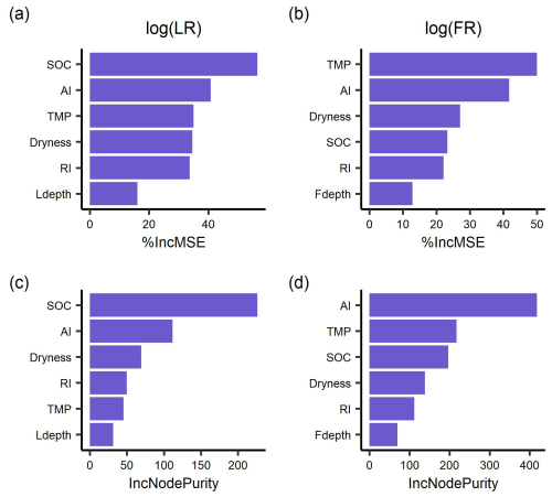 Figure 3The importance ranking of predictors for mean respiration rates during 48 h after rewetting, from laboratory (LR) and field (FR) measurements, based on random forest models using % IncMSE (a, b) and IncNodePurity (c, d). Predictors include soil organic content (SOC), aridity index (AI), soil dryness, rewetting intensity (RI), incubation temperature for LR and soil temperature for FR (TMP), and soil sampling depth for LR (Ldepth) and soil moisture sensor depth for FR (Fdepth).