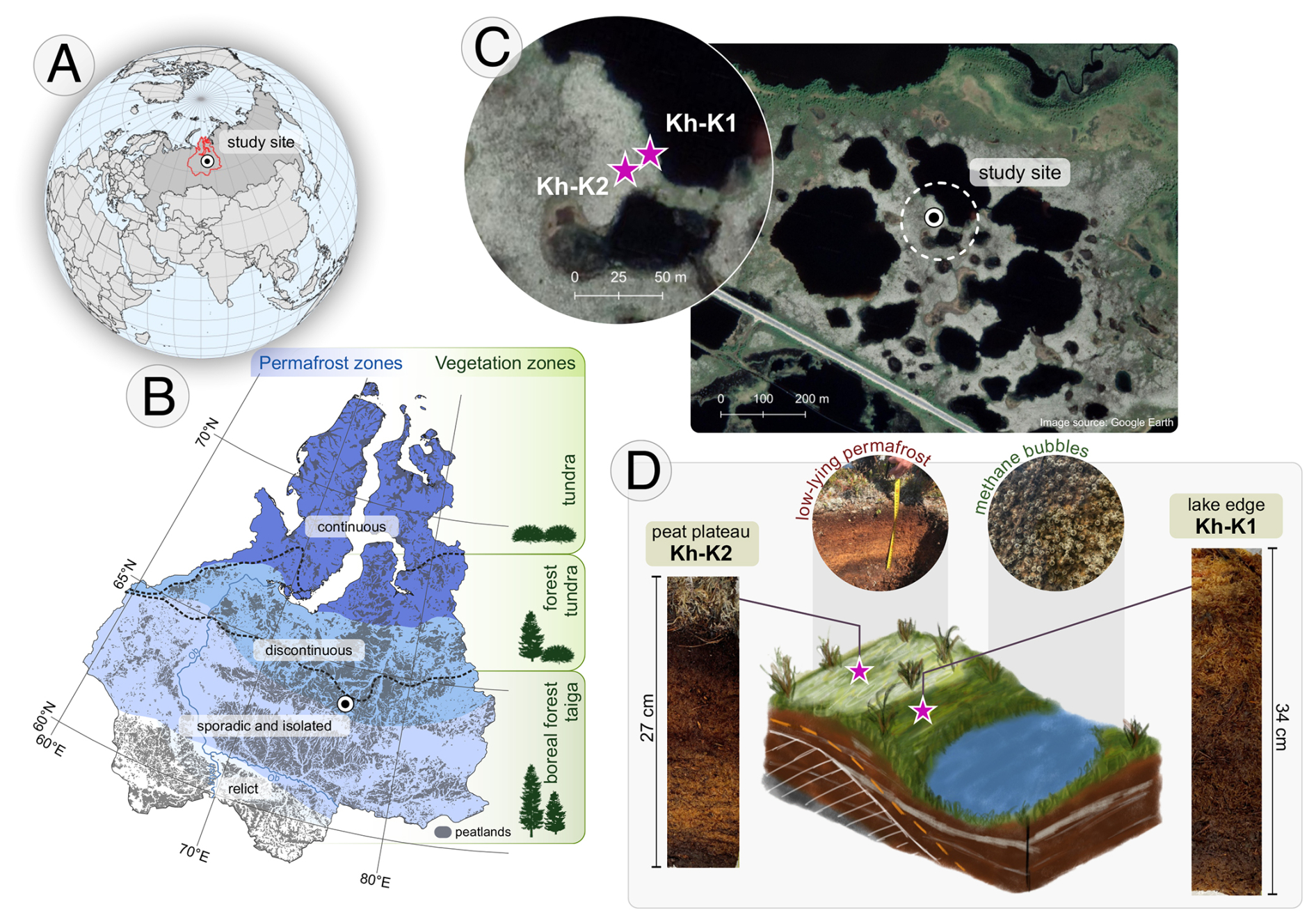 The permafrost in Western Siberia was mainly developed in Late Pleistocene (18–27 ka BP), and during the most favourable conditions, the southern limit reached 48–49° N (Duchkov, 2006). The early Holocene warming led to a northward shift of the border up to 60° N. During the Subatlantic cooling (2–1.3 ka BP), an epigenetic permafrost aggradation started, and peat deposits accumulated after deglaciation were first to freeze (Kondratjeva et al., 1993). The good insulating properties of Sphagnum mosses allowed frost to persist during warmer seasons and extend into the deeper mineral layers. This process led to the development of permanently frozen peatlands and the formation of palsas due to the cryogenic lifting of the peatland's surface (Martini et al., 2007). The characteristic feature of discontinuous permafrost is thermokarst lakes, which developed in the Khanymei area around 2.5 ka BP under stable permafrost conditions (Martini et al., 2007; Raudina et al., 2017).