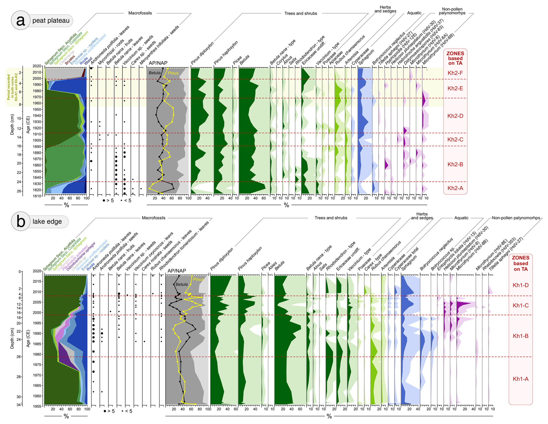 Figure 5Macrofossils and pollen diagram with exaggeration from peat cores: (a) Kh-K2 – peat plateau and (b) Kh-K1 – lake edge. The subfossil vegetative fragments and carpological remains are represented as either present or absent in each sample. Zonation based on testate amoebae CONISS was added to the graph.