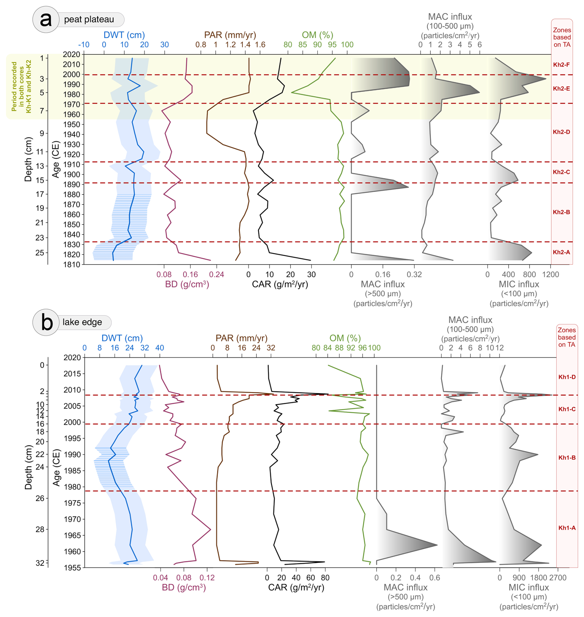 In the first zone Kh2-A there is a dominance of Unknown TA_Khan (Fig. 4), Difflugia pulex type, and the presence of Centropyxis aculeata type (Fig. 3a) – indicators of wet conditions (Halaś et al., 2023). Bigger TA aperture size, higher shell biovolumes, and more spherical shells also suggest wet conditions. TA species with agglutinated shells are the most abundant in this zone. Based on TA, this zone was characterized by wet conditions, with DWT around 4 cm and a pH of 5.1. The presence of green algae genera Botryococcus (Fig. 5a) also indicates a wetter environment (Pandey et al., 2023), while the presence of fungi Helicoon pluriseptatum HdV-30 a shift towards drier oligotrophic conditions (Kuhry, 1997). This period is characterized by a ligneous layer with roots and wood (Fig. 5a); however, ca. 1830 CE Sphagnum Secc. Cuspidata starts to take over the peatland surface. Numerous seeds of shrubs (Vaccinium sp.) and sedges (Carex sp.), as well as leaves of dwarf shrubs (Betula nana), are present in the sediment. In this zone, a high peak of Betula pollen was recorded, as well as the presence of shrubs Rhododendron tomentosum, Ericaceae, and Vaccinium. After ca. 1820 CE, a decrease in Betula pollen was inferred, which coincides with the period of high MIC that occurred between 1814 and 1835 CE (Figs. 5a, 6a). Peat accumulation in this period remains low and stable (∼1.3 mm yr−1), while carbon accumulation decreases from 29.5 to 8.8 g m−2 yr−1.