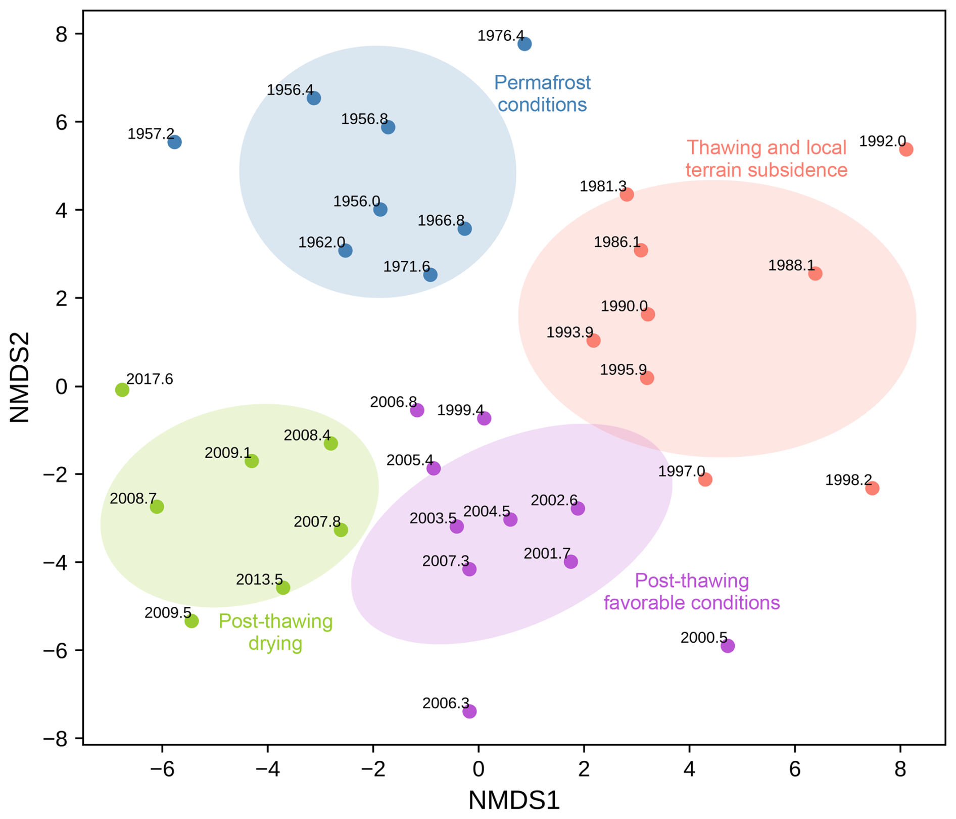 Figure 7Two-dimensional NMDS ordination plot with K-Means clustering showing the distribution of testate amoebae samples from the Kh-K1 core (lake edge) over time. Ellipses represent the 95 % confidence interval based on the covariance matrix of each cluster. Each point represents a sample, with year labels indicating temporal changes.