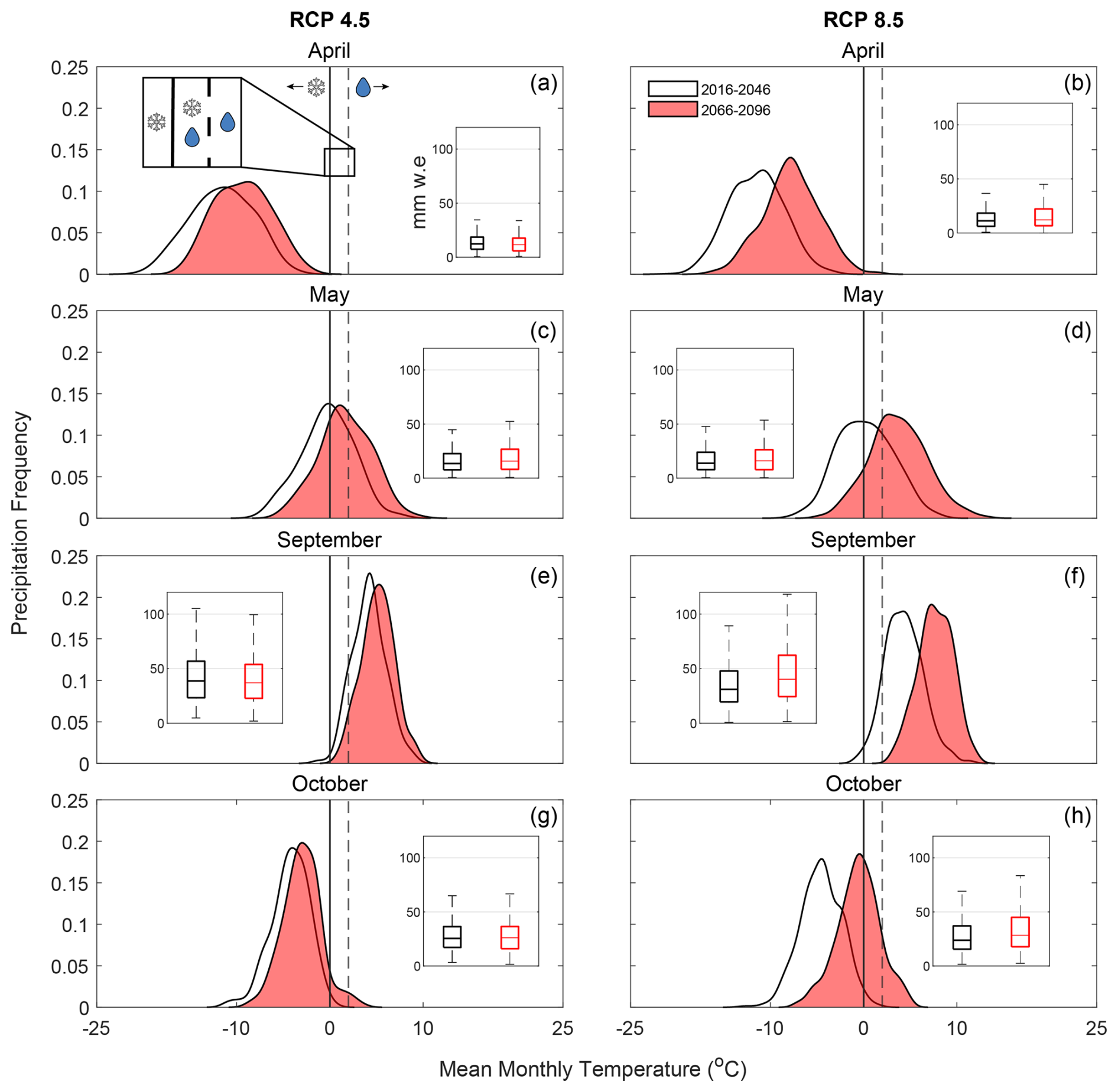 Figure 2The half-violin plots show the frequency distribution of precipitation events as a function of air temperature for TVC in April, May, September, and October under RCP 4.5 (a, c, e, g) and RCP 8.5 (b, d, f, h), from an ensemble of 33 NA-CORDEX GCM–GCM combinations (RCP 4.5 n= 6, RCP 8.5 n= 27). The white violins with black outlines represent 2016–2046 and red violins 2066–2096. The height of each violin represents the frequency of precipitation events at a given temperature. The solid and dashed black lines at 0 and 2 °C show transitional temperatures between snow and rain, where CLM5.0 treats the transition in the precipitation phase as a linear ramp. The inset boxplots show the monthly total precipitation for the two 30-year periods.