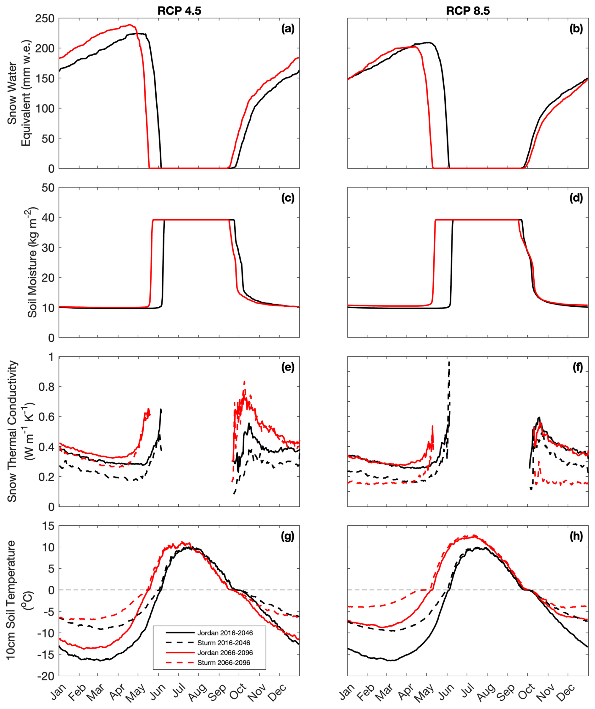 An increase in future rainfall in September impacts both the timing of winter onset of snow accumulation and the magnitude of peak SWE later in the winter (Fig. 3). The duration of winter snow cover is shorter in the future where future spring melt-out occurs between 18 to 25 d earlier in both RCP scenarios, while the timing of the initial snow accumulation remains similar (± 4–6 d). The projected future peak annual SWE shows an increase of 14 mmw.e. under RCP 4.5 and a decrease of 6 mmw.e. under RCP 8.5 and early spring snowmelt is coincident with earlier increases in soil temperature in mid-late spring (Fig. 3a–d). Compared to CORDEX-Jordan, snow thermal conductivity using CORDEX-Sturm is lower on average by 0.07 and 0.14 Wm-1K-1 under RCP 4.5 and RCP 8.5, respectively.