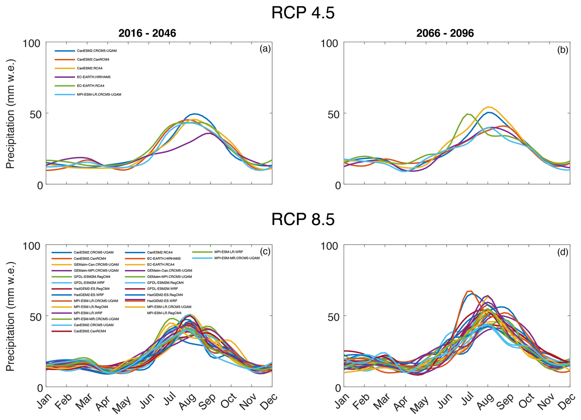 Figure A1The NA-CORDEX ensemble median monthly precipitation (January–December) split by individual ensemble member (RCP 4.5 n= 6, RCP 8.5 n= 27).