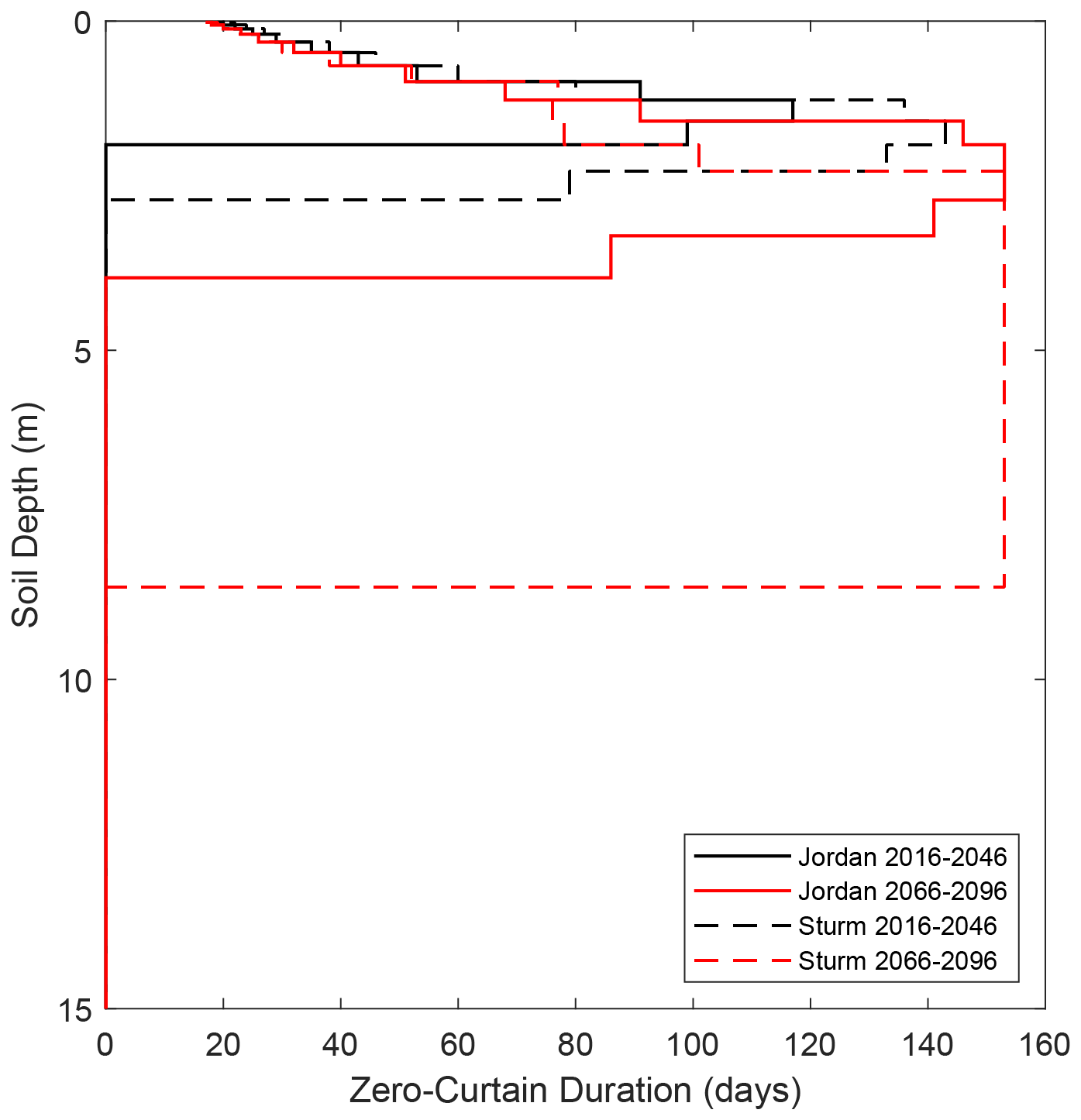 Figure B1The August–December zero-curtain duration with soil depth for the CORDEX-Jordan (solid black and red lines) and CORDEX-Sturm (dashed black and red lines) for 2016–2046 and 2066–2096.