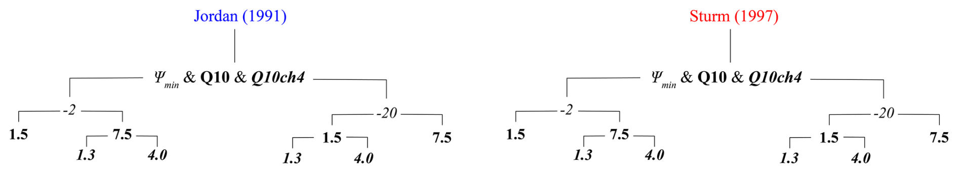 Figure C1Schematic showing the range of Q10 and Ψmin values applied to CLM5.0 using the CORDEX-Jordan (blue) and CORDEX-Sturm (red) for the modelling experiment.