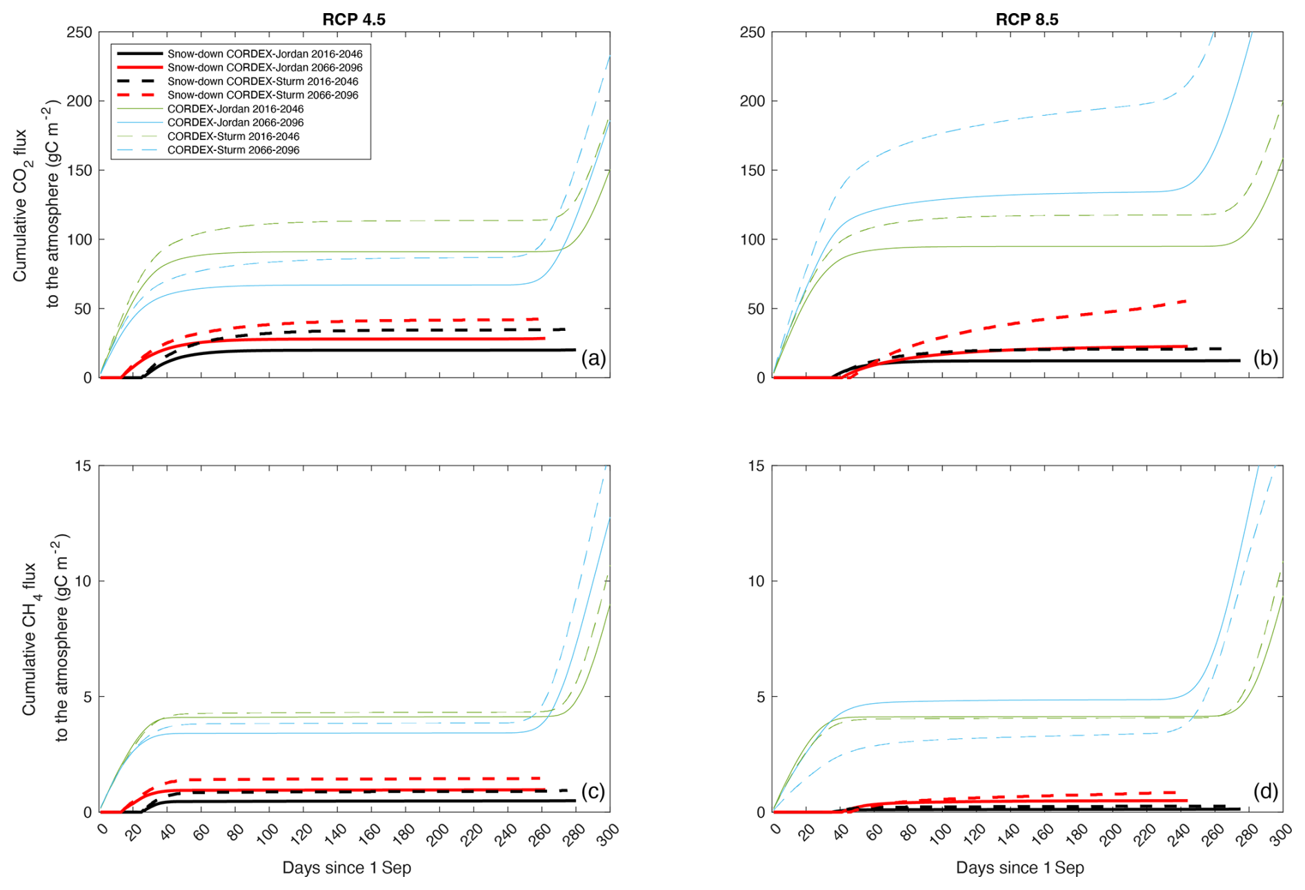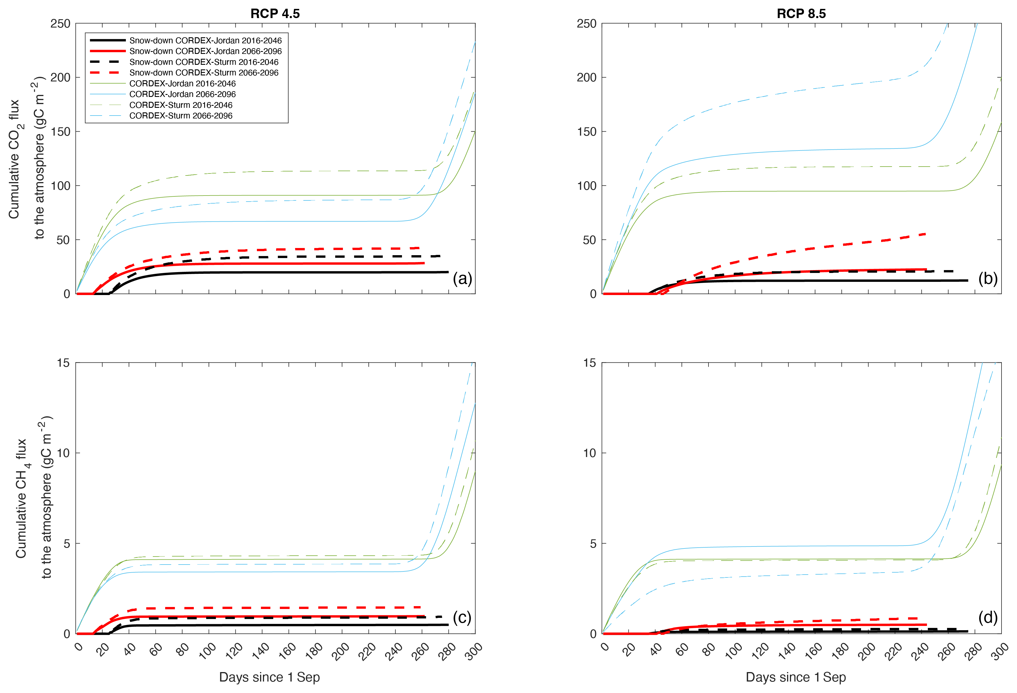 Figure 5The CLM5.0 simulated cumulative CO2 and CH4 flux to the atmosphere during snow cover periods over two 30-year time periods: 2016–2046 (black) and 2066–2096 (red) under RCP 4.5 and RCP 8.5, for TVC, using the meteorological forcing from an ensemble of 33 RCM–GCM combinations (RCP 4.5 n= 6, RCP 8.5 n= 27). The solid lines show the median values from the CORDEX-Jordan ensemble and the dashed lines show values for the CORDEX-Sturm ensemble. The variable plot line lengths are indicative of changes in the snow-season length.