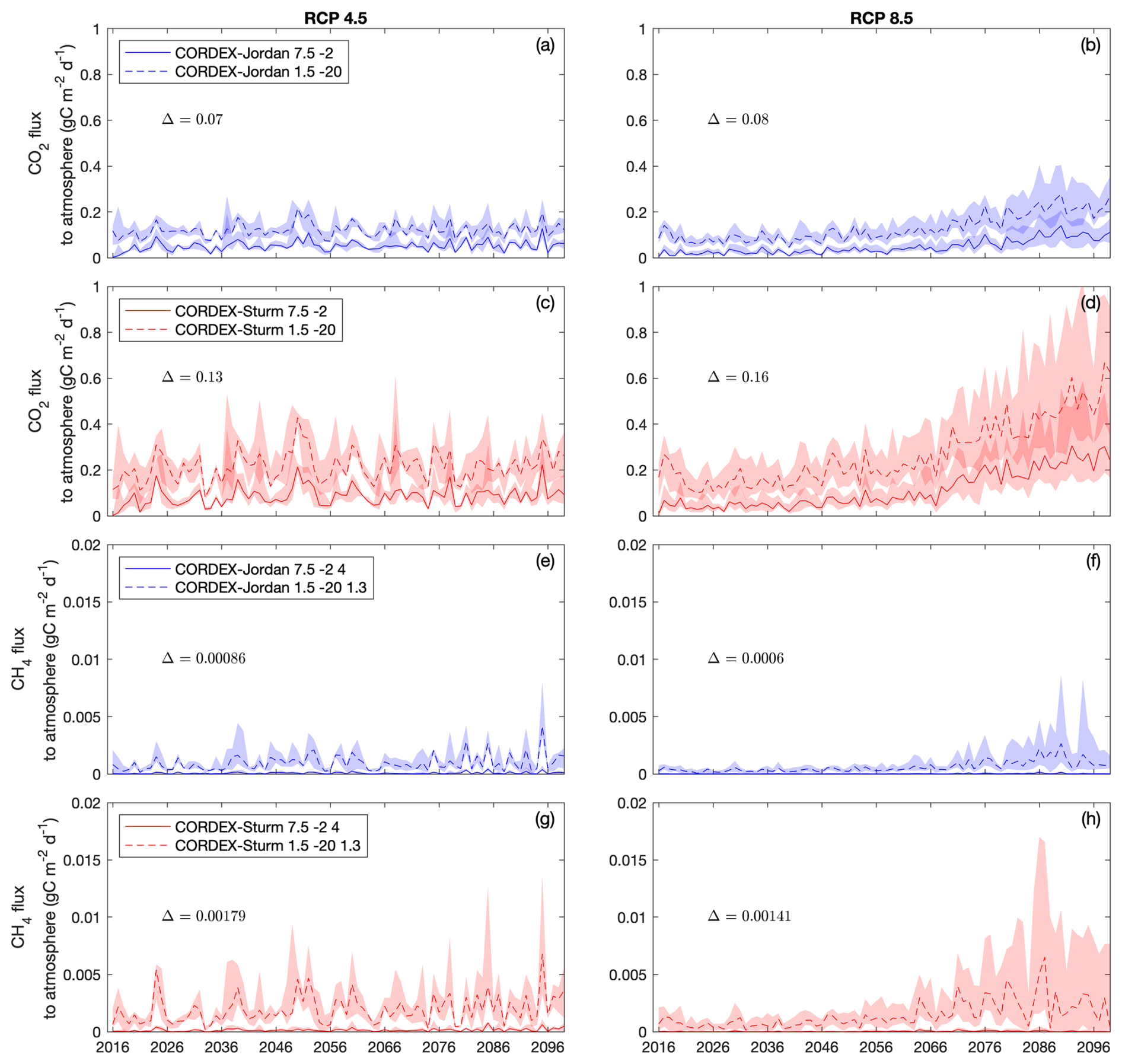 Figure E1The CLM5.0 simulated median SR for the winter season, comparing the CORDEX-Jordan (blue) ensemble with CORDEX-Sturm (red) for two RCP scenarios (RCP 4.5 n= 6, RCP 8.5 n= 27). The shaded areas represent the 75th and 25th percentiles and represent the CORDEX ensemble distribution. Each plot shows the extremes of Q10, Ψmin, and Q10ch4 from the chosen parameter values seen in Fig. C1, where the lower end Ψmin=2, Q10= 7.5, Q10ch4 = 4 suppresses carbon output and the upper end Ψmin=20 MPa, Q10= 1.5, Q10ch4 = 1.3 stimulates the carbon output. The average difference between the displayed parameters (solid versus dashed lines, Δ) is included on each subplot.