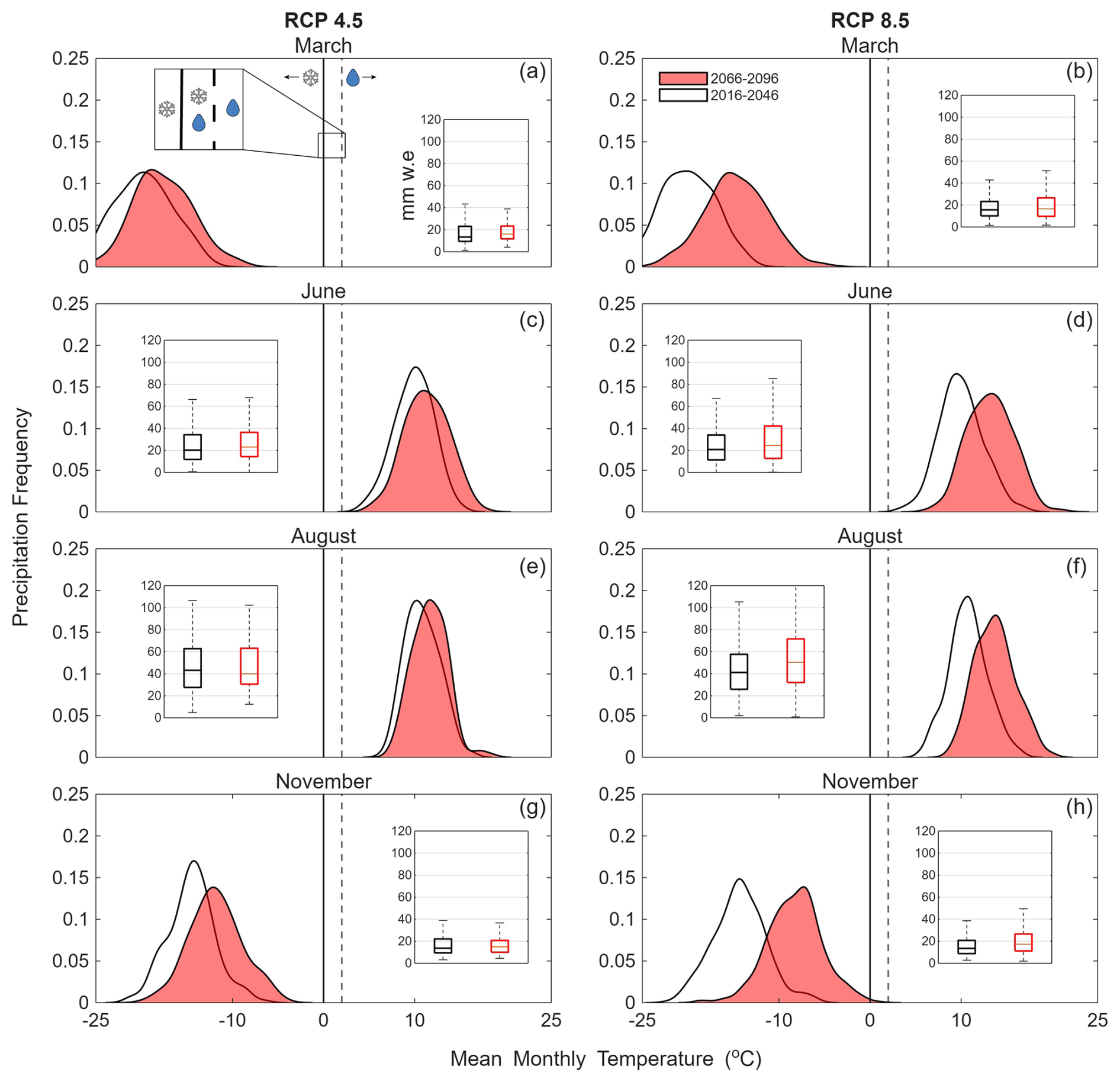 Figure F1The half-violin plots show the frequency distribution of precipitation events as a function of air temperature for TVC in March, June, August, and November under RCP 4.5 (a, c, e, g) and RCP 8.5 (b, d, f, h) over two 30-year time periods: from an ensemble of 33 NA-CORDEX GCM–GCM combinations (RCP 4.5 n= 6, RCP 8.5 n= 27). The white violins with black outlines represent 2016–2046 (black) and the red violins 2066–2096 (red) under RCP 4.5 and RCP 8.5, for TVC, using the meteorological data from an ensemble of 33 NA-CORDEX GCM–GCM combinations (RCP 4.5 n= 6, RCP 8.5 n= 27). The height of each violin represents the frequency of precipitation events at a given temperature. The solid and dashed black lines at 0 and 2 °C show the transitional temperatures between snow and rain, where CLM5.0 treats the transition in precipitation phase as a linear ramp. The inset boxplots show the monthly total precipitation for the two 30-year periods.
