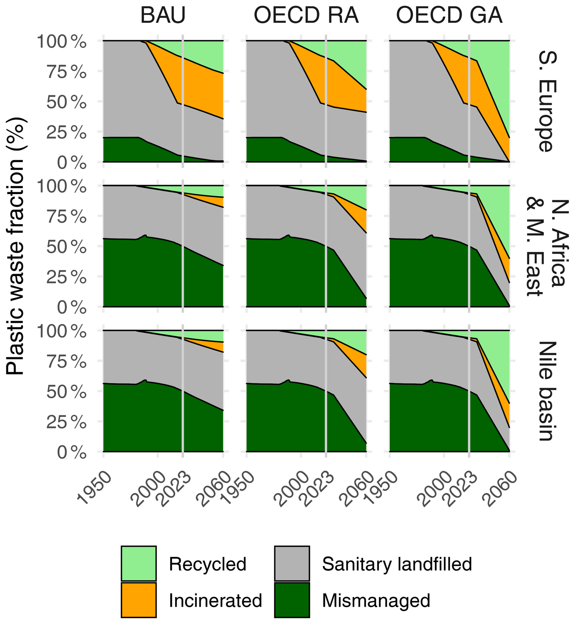 Regional action (OECD-RA). This scenario consists of a global reduction of 18 % of plastic waste generation compared to the 2060 BAU projection, linearly increasing from 2025. The OECD-RA also sets recycling goals toward 2060 for different economic regions: a 40 % recycling rate for EU countries (assimilated to S. Europe) and 20 % for other countries (assimilated to N. Africa, M. East, and the Nile basin) by 2060, linearly increasing from 2025. Similarly, OECD-RA aims to reduce the fraction of MMPW by 2060 to <1 % in S. Europe and 7 % for N. Africa, M. East, and the Nile basin (see Fig. 5).
