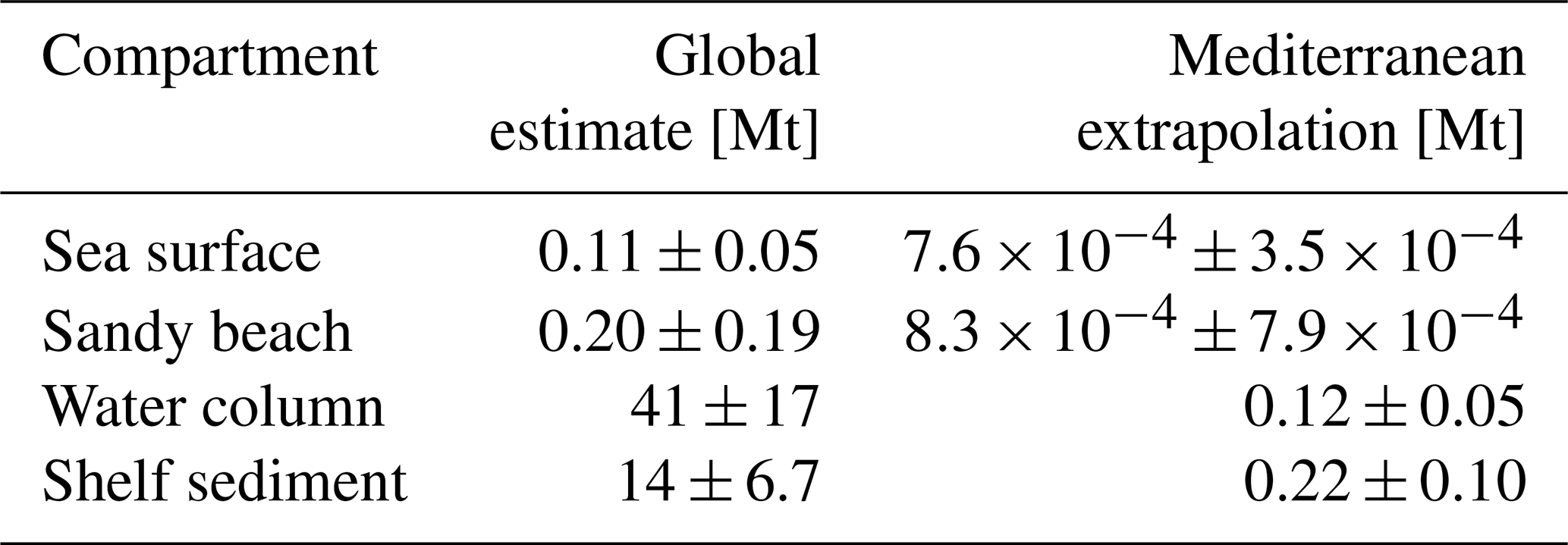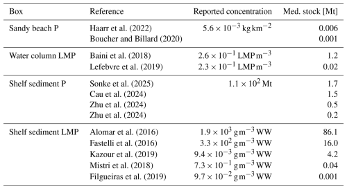 where L [cm] is the characteristic length of the plastic particles; δP = 1 g cm−3 and δS = 1.70 g cm−3 are the average density of plastic particles (Kooi and Koelmans, 2019) and marine sediment (Tenzer and Gladkikh, 2014), respectively; and τS=2.97 [–] is the wet-to-dry sediment density ratio (Barrett et al., 2020). This volumic concentration q is then converted into a seafloor surface concentration [g m−2] by estimating the mass of sediments deposited since 1950, based on sedimentation rates (see Eq. S1 in the Supplement for details). This method accounts for the variation in the plastic sedimentation rate since 1950 and for different core sampling depths. The corrected concentrations are then multiplied by the seafloor surface (4.50×105 km2 for shelf sediment, 2.05×106 km2 for deep sediment (Poulos, 2020)) to obtain the total stock for the compartment. A single study by Cutroneo et al. (2022) observed LMP concentration in the deep Mediterranean sediments. However, this study is judged not to have been representative of the whole Mediterranean deep-sediment pool as it was conducted in a marine canyon located 10 km from the city of Toulon (France) and was therefore significantly impacted by coastal human activities. A summary of the literature data on shelf sediments is presented in Table 2. Estimated stocks are 1.0 ± 0.7 Mt and 21.3 ± 36.8 Mt for shelf-sedimented P and LMP, respectively.