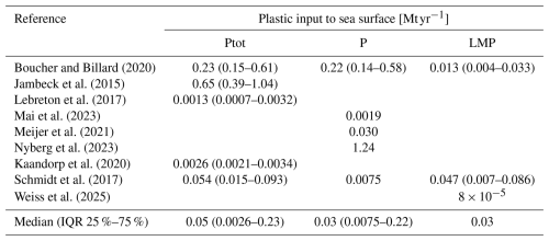 The estimations of Kaandorp et al. (2020) of global floating P and LMP and the estimation of Sonke et al. (2025) of global LMP were downscaled to the Mediterranean Sea surface in order to account for the new higher macroplastic quantification. A summary of the plastic stock at the Mediterranean Sea surface is presented in Table 1 and amounts to Mt (median, IQR – Mt) of floating P and Mt (median, IQR – Mt) of floating LMP. Note that no reliable SMP data were found for the Mediterranean region (see Sect. 2.4.5).