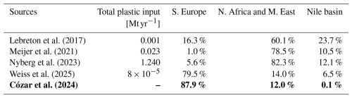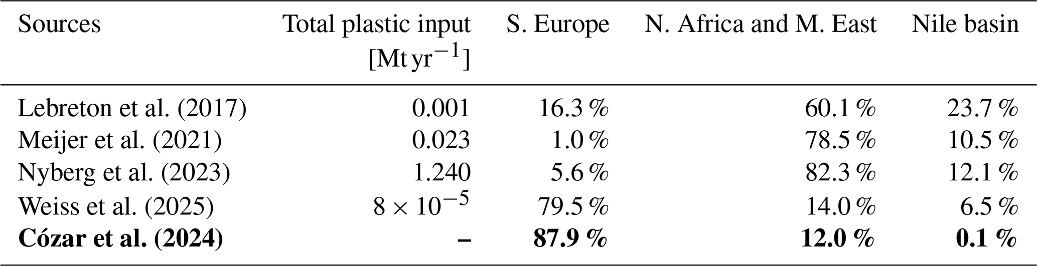 Boucher and Billard (2020)Jambeck et al. (2015)Lebreton et al. (2017)Mai et al. (2023)Meijer et al. (2021)Nyberg et al. (2023)Kaandorp et al. (2020)Schmidt et al. (2017)Weiss et al. (2025)To estimate the relative contribution of each region to the total plastic input from land to sea, the observations of Cózar et al. (2024) were used. This study links floating marine litter (mostly macroplastic) aggregates at the Mediterranean Sea surface, visible through satellite imaging, to land-based sources. Cózar et al. (2024) found that the geographical distribution of plastic inputs is dominated by S. Europe (87.9 %), followed by N. Africa and M. East (12.0 %) and then the Nile basin (0.1 %). These results differ from several earlier studies that estimated the geographical distribution of plastic input from land to sea globally (Lebreton et al., 2017; Meijer et al., 2021; Nyberg et al., 2023). For each of these three studies, we extracted the Mediterranean data from the global dataset and the relative contribution of each region, computed in QGIS (version 3.28.4). Table 5 summarizes the different results. The studies of Lebreton et al. (2017), Meijer et al. (2021), and Weiss et al. (2025) are calibrated on a global dataset, which includes limited observations from Mediterranean rivers and does not include any African rivers. The model from Nyberg et al. (2023) is not calibrated against observed data. For these reasons, we consider that these three earlier studies are less robust in representing the geographical repartition of plastic inputs at the Mediterranean scale. We therefore decided to adopt the Cózar et al. (2024) results on macroplastic distribution, as they are specifically based on Mediterranean Sea observations. A detailed decision table supporting this choice is presented in Table S4 in the Supplement. In the absence of other reliable estimations on LMP and SMP input distribution, the Cózar et al. (2024) percentages (Table 5) were applied to LMP and SMP for computing plastic input to sea in Eq. (6).