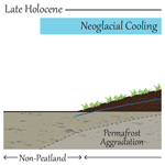 A distinct setting of our study region is that peatlands are primarily found on river floodplains and underlain by permafrost. Early surveys noted a spatial overlap between peat-forming wetlands and permafrost in Northeast China, interpreted as evidence for a symbiotic relationship (Sun, 2000). Geological studies mapping past permafrost boundaries showed that Northeast China was nearly permafrost-free during the warmest period of the Holocene, but the permafrost boundary moved southward by approximately 300 km during the late Holocene and the LIA (Fig. 1b; Jin et al., 2000, 2016). This permafrost history provides a framework for formulating our hypothesis that the transition from seasonally frozen ground to permafrost might be an agent in regional peatland formation. We propose that permafrost aggradation and its possible expansion toward rivers during cooling periods at our site resulted in thinning active layers and reduced water infiltration. These changes likely triggered feedback mechanisms that enhance poorly drained, waterlogged soil conditions locally (Sun, 2000; Ishikawa et al., 2005; O'Donnell et al., 2012), leading to further better OM preservation than by climate cooling and wetting alone and eventually net peat accumulation (Sun, 2000; Treat et al., 2014).