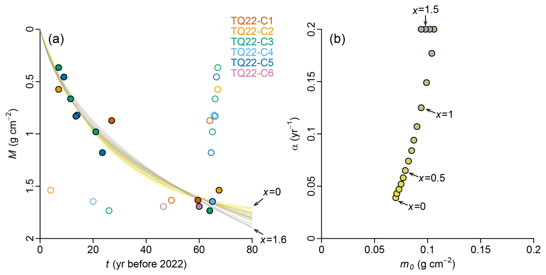 Figure 3Results of near-surface peat accumulation modeling. (a) The relationship between cumulative peat mass (M) and time (t) derived by combining all post-bomb dates of six cores. Rejected ages after post-bomb calibration are shown as open circles. Accepted ages (closed circles) were fitted using the general expression of Clymo's model, with fitted curves plotted in different colors for different assumptions of recalcitrant effects (x). (b) The fitted values of annual production m0 and decay coefficient α under different x values.