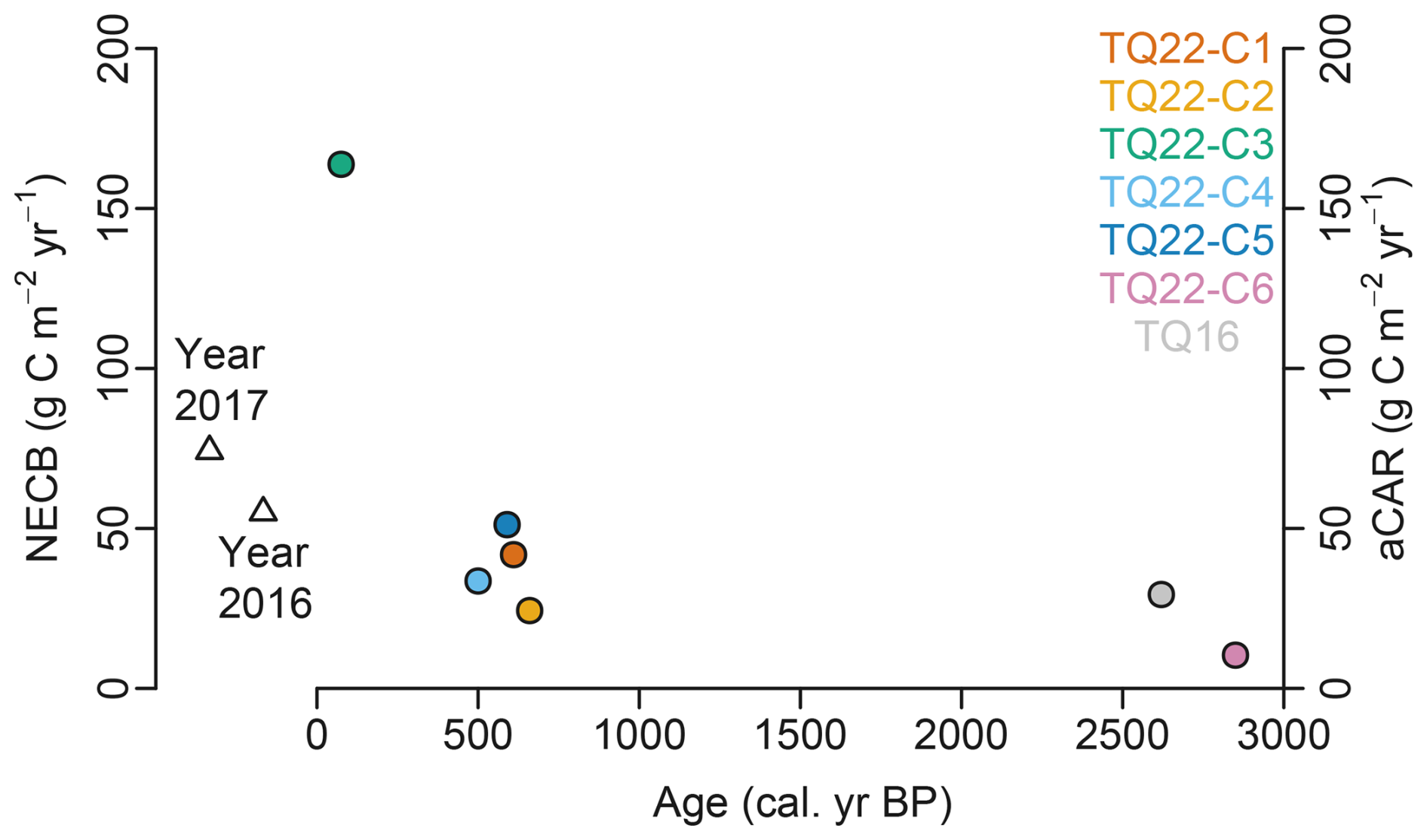 The long-term aCARs for six cores show an age-dependent pattern with the highest aCAR (163.8 g C m−2 yr−1) found in the youngest core, TQ22-C3, and the lowest aCAR (10.4 g C m−2 yr−1) found in the oldest core, TQ22-C6 (Fig. 5). The other four cores are of similar ages (660–500 cal. yr BP) but still have highly variable aCARs (24.3–51.2 g C m−2 yr−1), showing within-site heterogeneity in the rate of C sequestration. In comparison, the currently available NECB at the same site (Fig. 5), derived mostly from atmospheric C flux measurements, indicates a further higher rate of C sequestration at about 55 and 74.2 g C m−2 yr−1 in 2016 and 2017, respectively (Sun et al., 2024), after additionally accounting for the small fluvial C losses of 4.7 g C m−2 yr−1 (Guo et al., 2018).