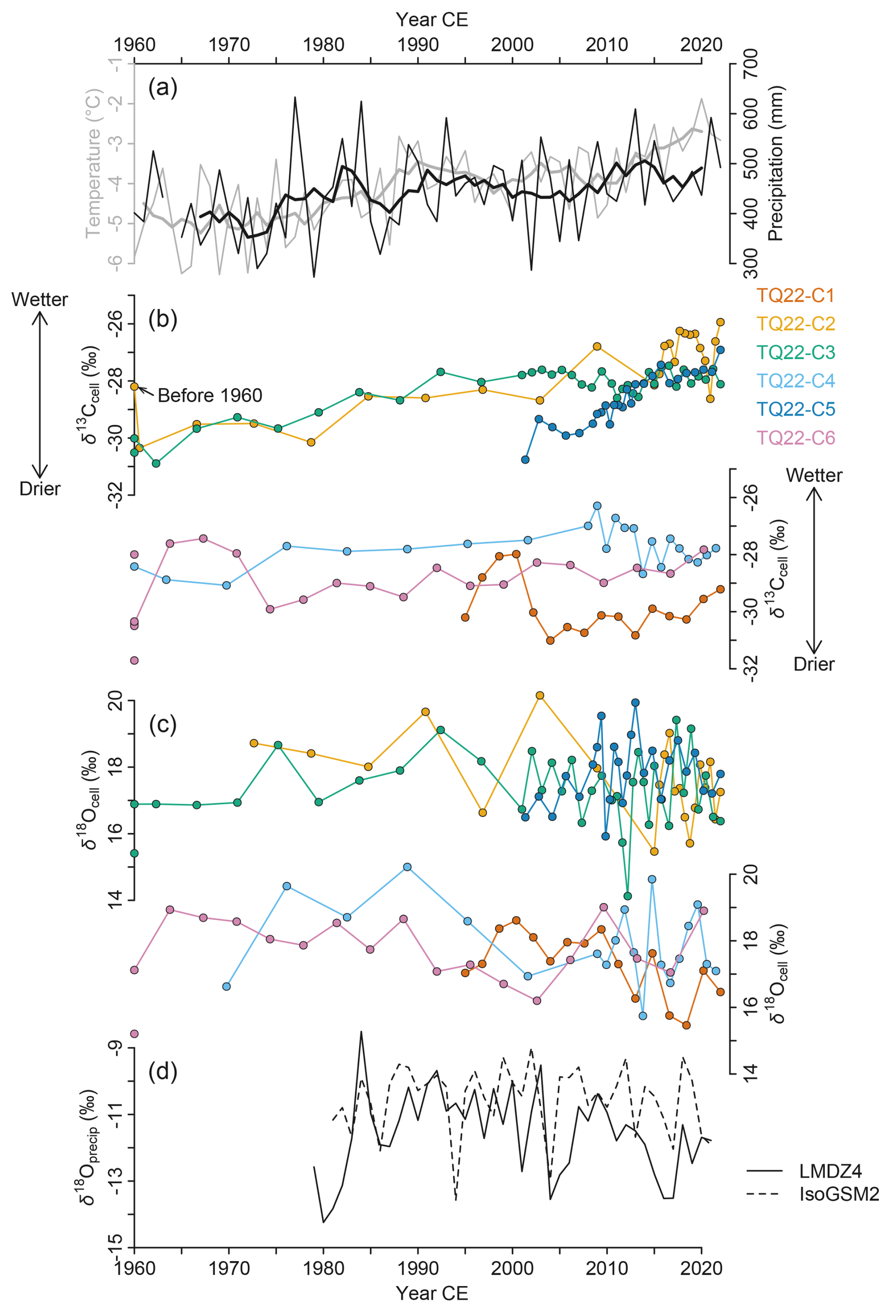 Figure 6Isotopic records of environmental changes from the period 1960–2022 from high-resolution near-surface peat of six cores. (a) Annual temperature and precipitation records from Mohe weather station, located about 24 km from the Tuqiang peatland. (b) “Suess effect”-corrected Sphagnum δ13Ccell records plotted separately for three cores showing progressively wetter conditions (higher δ13Ccell) and three other cores that do not show clear trends. Data from earlier periods (before 1960) are plotted along the left y axis. (c) Similar to (b) but for Sphagnum δ18Ocell records. (d) Amount-weighted mean growing-season (May–September) precipitation δ18O for the location of Tuqiang peatland simulated from two nudged isotope-enabled general circulation models, LMDZ4 (Risi et al., 2010) and IsoGSM2 (Yoshimura et al., 2008), the outputs of which are available from the period 1979–2021.
