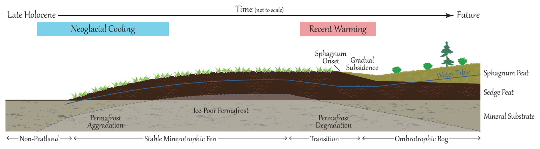 Together, our analysis links the distinct climate drivers of peatland initiation and lateral expansion with permafrost–hydrology feedback, underscoring the importance of considering surficial geology and cryosphere dynamics in understanding the diverse pathways of peatland formation.