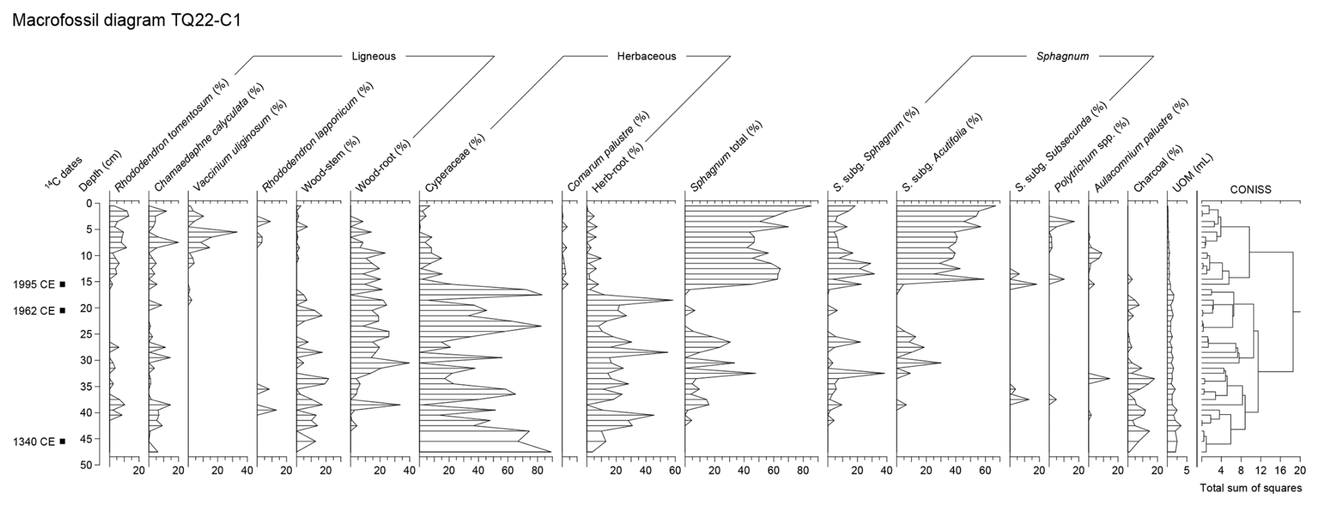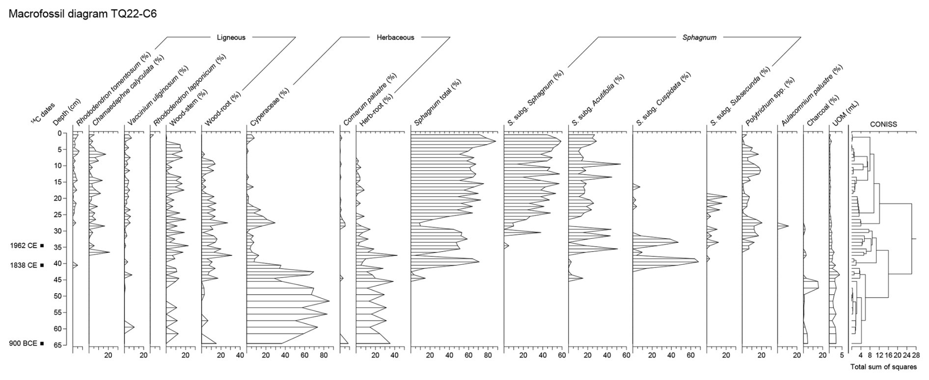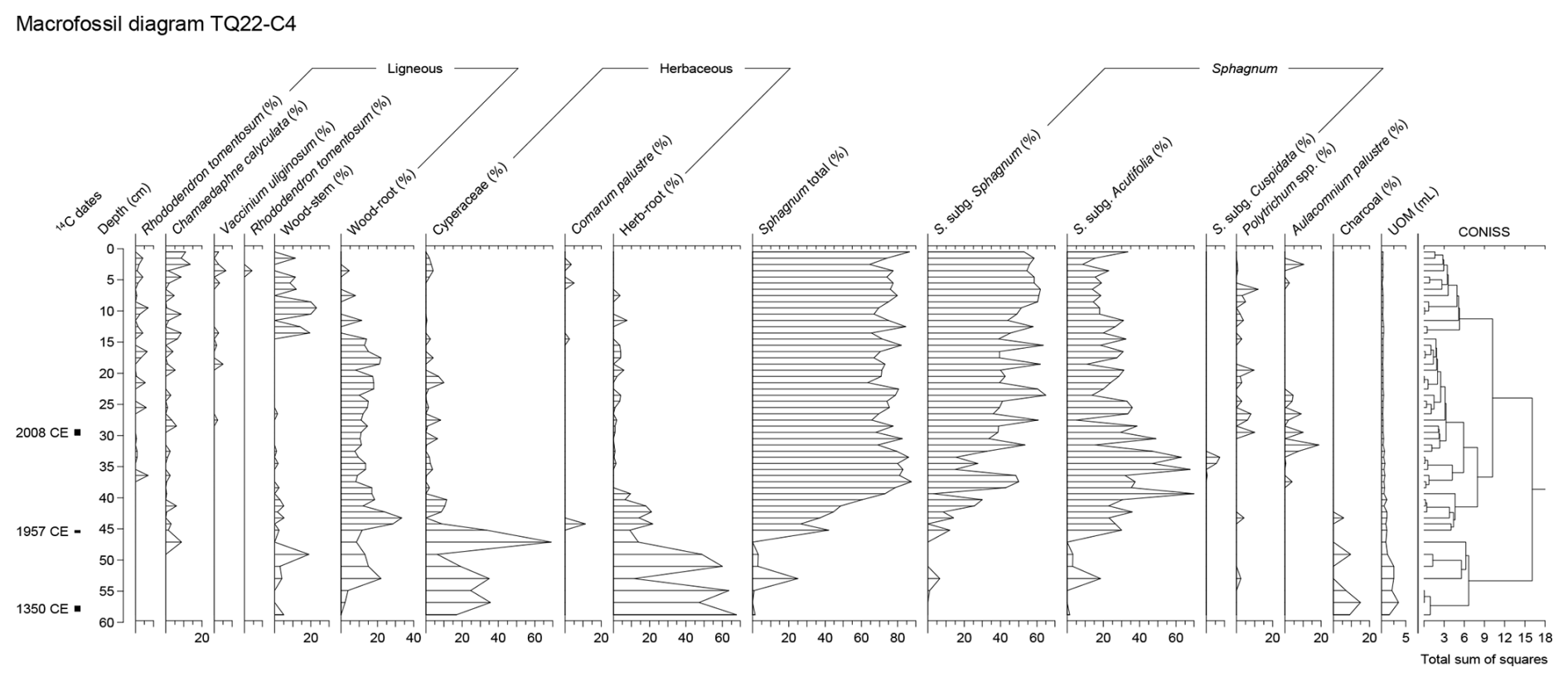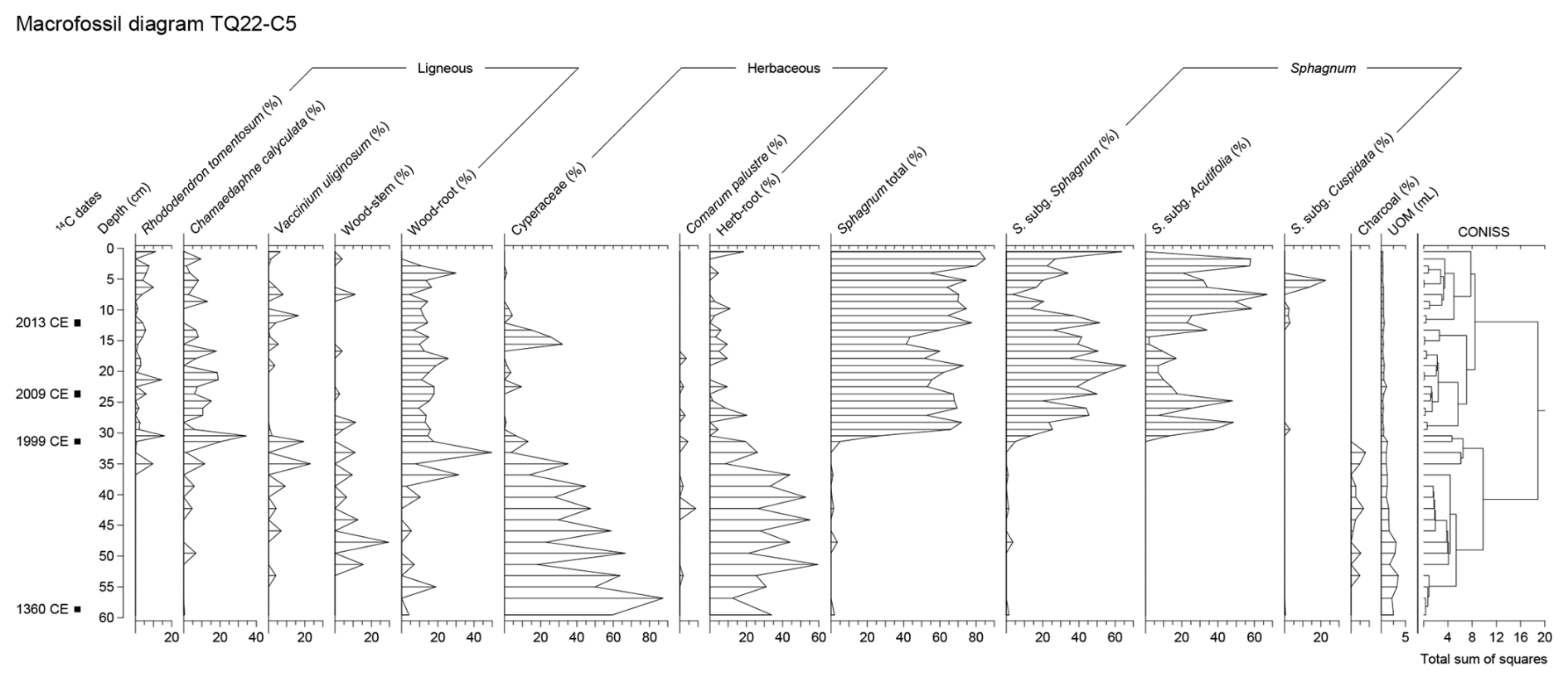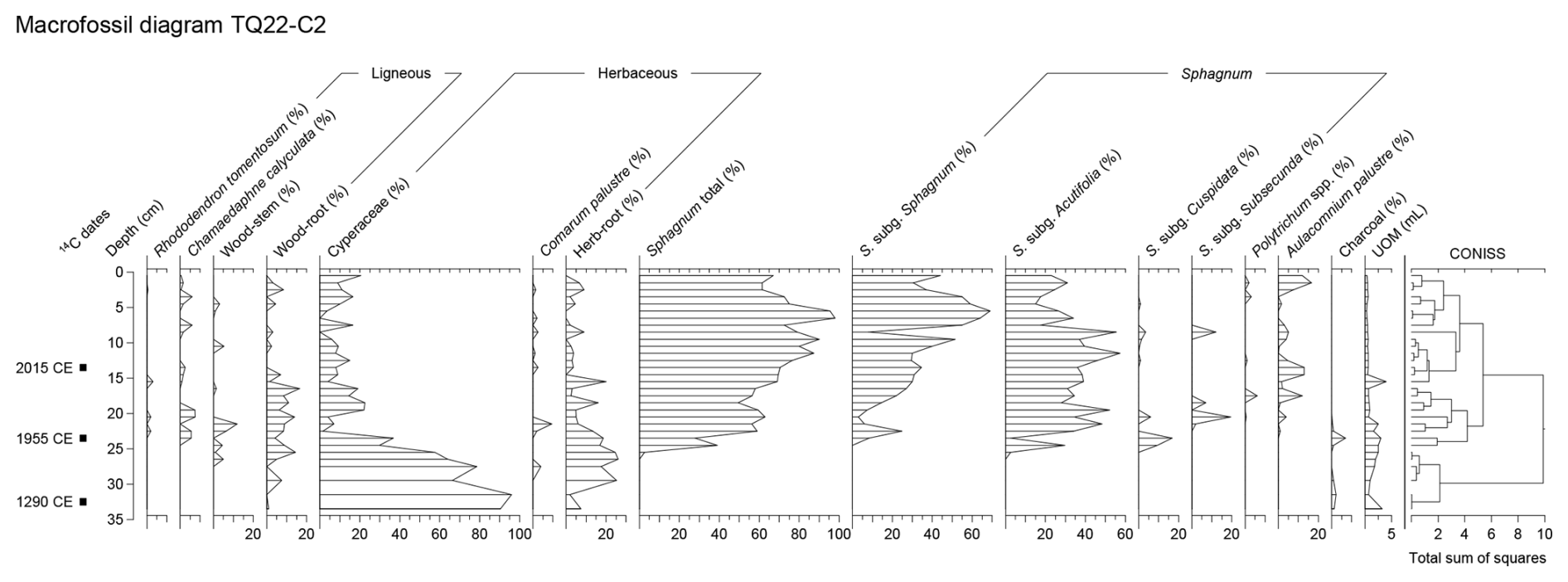 Full plant macrofossil diagrams are presented in Figs. A1–A6. Macrofossil analysis reveals transitions from lower sedge (Cyperaceae) peat to upper Sphagnum peat in all cores, although cores TQ22-C1 and TQ22-C6 exhibit somewhat fluctuating abundances of Cyperaceae and Sphagnum macrofossils across the transition. We define the onset of Sphagnum peat over sedge peat in each core as the greatest depth where Sphagnum macrofossils exceed 40 % abundance (Table 1 and Fig. 2). The chronology of this stratigraphical transition is well constrained in all six cores. The median ages are 1995, 1955, 1958, 1957, 2001, and 1838 CE, respectively.