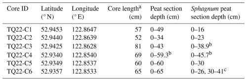 a Measured in the field. b Decimals are reported to correct core compression or expansion during sample transportation. c Gap in Sphagnum peat section is due to changes in macrofossil compositions.
