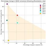 Figure 9Relationship between the percentage change in modelled estimates of annual UK isoprene and total monoterpene emissions by afforestation experiment, compared to present day land cover.