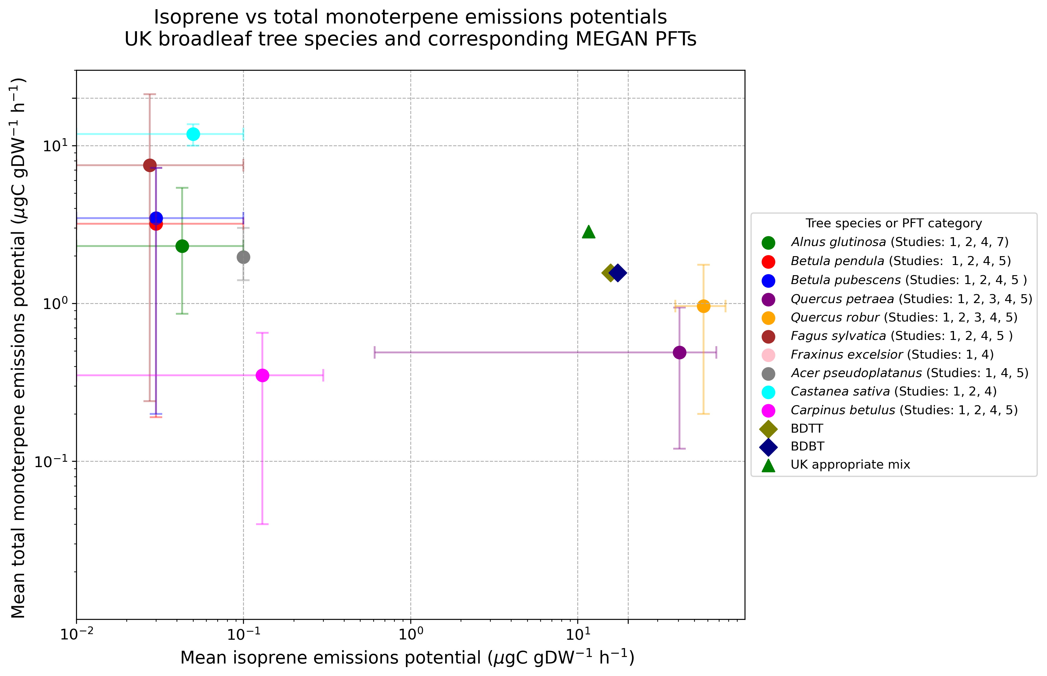 Figure 3Relationship between the mean isoprene and mean total monoterpene emissions potentials for UK appropriate broadleaf tree species. Circular markers represent the mean of values obtained for a given broadleaf tree species from the literature (see Table 2). Triangular markers represent a UK appropriate value calculated as a mean of broadleaf species emissions potentials weighted according to their present-day abundance in the UK (Forest Research, 2023). Diamond markers represent the emissions potentials of corresponding PFT categories within the default release version of MEGANv2.1 (BDTT and BDBT). Numbers in the figure legend correspond to the study number detailed in Table 2. Error bars indicate the minimum and maximum values obtained from the literature.