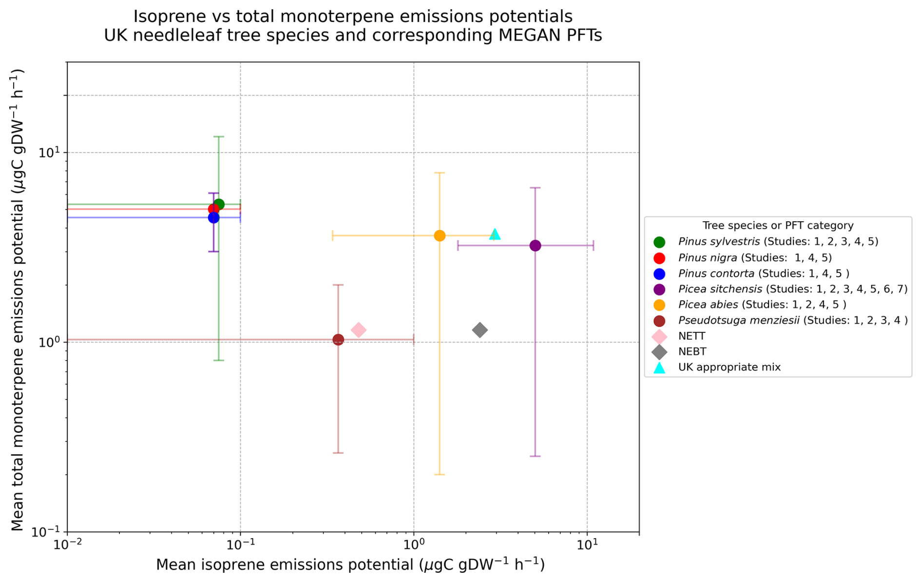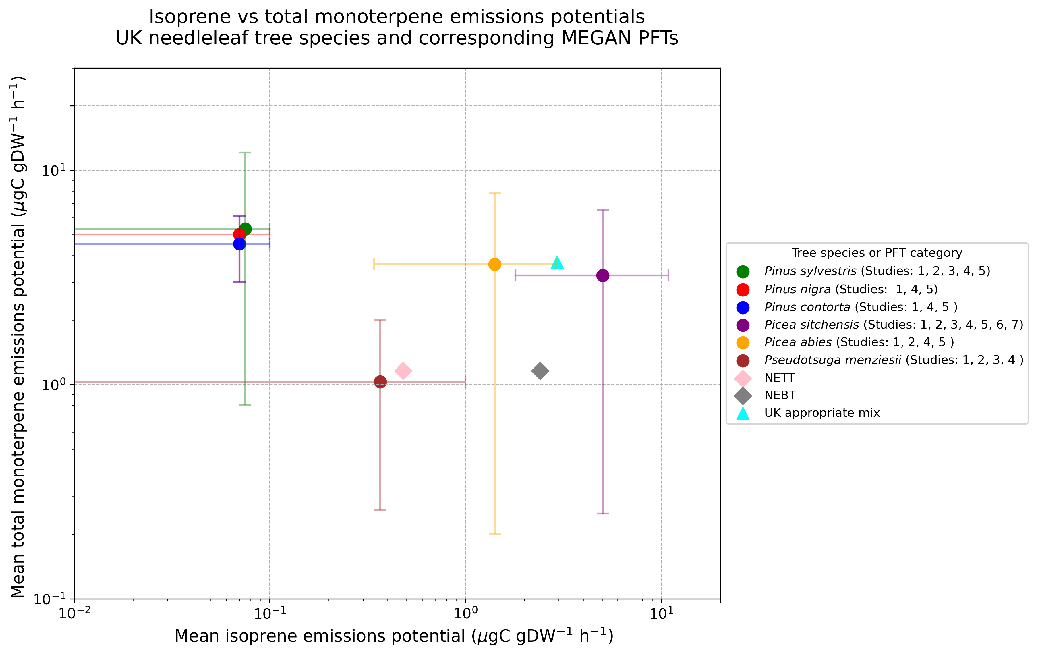 Figure 4Relationship between the mean isoprene and mean total monoterpene emissions potentials for UK appropriate needleleaf tree species. Circular markers represent the mean of values obtained for a given needleleaf tree species from the literature (see Table 2). Triangular markers represent a UK appropriate value calculated as a mean of needleleaf species emissions potentials weighted according to their present-day abundance in the UK (Forest Research, 2023). Diamond markers represent the emissions potentials of corresponding PFT categories within the default release version of MEGANv2.1 (NETT and NEBT). Numbers in the figure legend correspond to the study number detailed in Table 2. Error bars indicate the minimum and maximum values obtained from the literature.