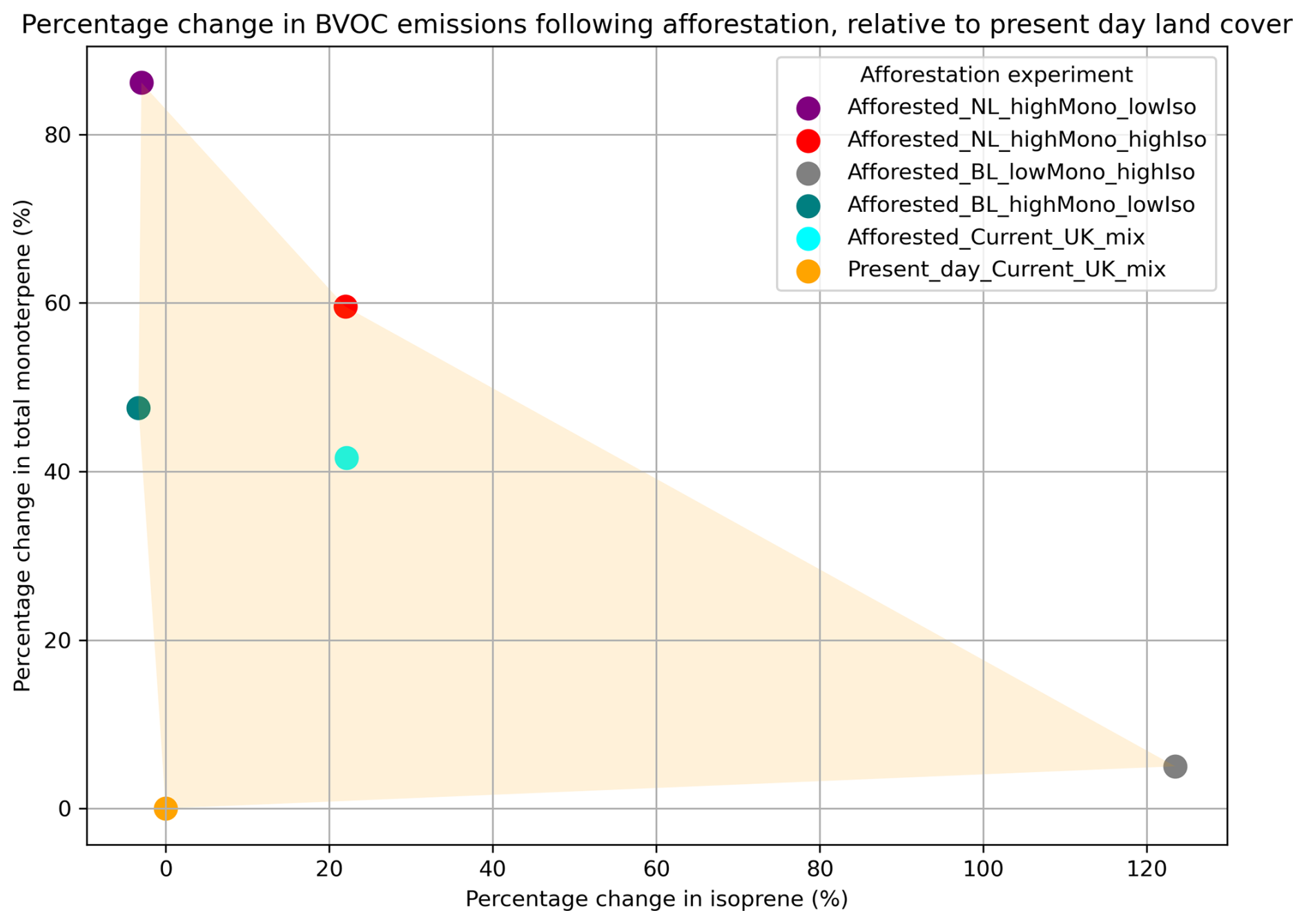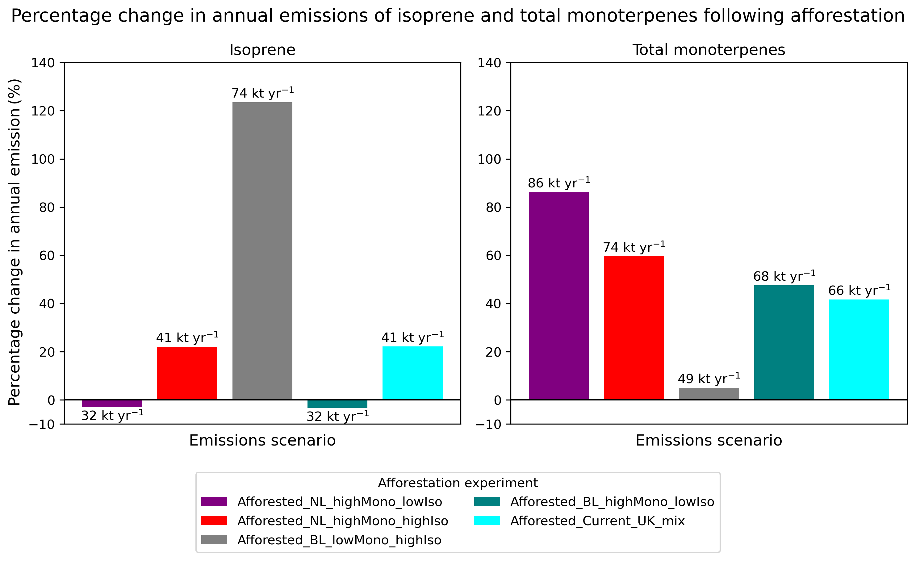 Figure 9 illustrates the relationship between changes in isoprene and total monoterpene emissions across the five afforestation experiments. With the combination of species mixtures examined, we demonstrate the possibility for isoprene emission to be reduced whilst delivering ambitious afforestation by 2050. However, in experiments where isoprene is reduced (by as much as −3 %), monoterpenes increase by at least 48 %. All experiments result in an increase in monoterpenes. This reflects the fact that all afforestation scenarios include tree PFTs that are higher emitters of monoterpenes than the grassland that has been replaced. Our experiment Afforested_BL_lowMono_highIso demonstrates the potential to minimise the increase in monoterpenes, with an increase of just 5 %, however this is estimated to deliver the most extreme change across all experiments in relation to isoprene, which increases by over 120 %. Our experiments demonstrate the range of futures that net-zero aligned UK afforestation could deliver for BVOC emission from natural vegetation.  We compare our rates of change to estimates of BVOC emissions from Purser et al. (2023) for the UK. When scaled to the same level of afforestation, their scenarios estimate changes in isoprene between −4 % and +53 %, whilst the change in monoterpenes in their scenarios is between approximately −3 and +42 % (Purser et al., 2023). The range of UK tree species explored in our paper captures greater extremes in emission potentials for both monoterpenes and isoprene than Purser et al. (2023) and we therefore estimate that more substantial relative changes in emissions are possible. However, the scale of change also depends on the land cover, and therefore emissions, that have been replaced, contributing uncertainty to estimates of relative change.