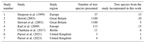Table 2Overview of tree emissions potential studies reviewed, including the number of tree species that data were presented for, and the number of tree species incorporated into this study.
