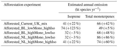 Table 5Modelled estimates of annual UK isoprene and total monoterpene emissions (thousand tonnes) and percentage change (relative to Present_day_UK_appropriate_mix) following afforestation to 19 % woodland cover for five afforestation experiments.