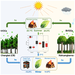 The OC EC ratios differ among various pollution sources, so the OC EC is useful for identifying the sources and emission characteristics of carbonaceous components in PM2.5. When the , it can be inferred that the secondary formation of OC is likely present (Chow et al., 2007). Studies have shown that OC EC ratios ranging from 1.0 to 4.2 indicate traffic sources, with approximately 0.8 for heavy diesel vehicles and 2.2 for light gasoline vehicles; ratios of 2.5 to 10.5 imply coal combustion; ratios of 16.8 to 40 indicate biomass burning (Schauer et al., 1999; Chen et al., 2005). Average OC EC ratios were 26.92 ± 16.42 at CB and 22.90 ± 9.78 at BN, which closely matched the values reported for biomass burning emissions. Table 1 showed the concentrations of OC and EC in PM2.5 at urban and forest sites. It was not difficult to find that OC EC at forest sites was considerably higher than that at urban sites. The average OC EC were 13.5 and 11.5, significantly exceeding 2.0, indicating substantial SOA formation, with higher ratios observed in summer. The elevated OC levels in summer likely resulted from the typically higher temperatures and stronger solar radiation promoted the active life activities in forest areas, which favored the emission of VOCs and thus promote the occurrence of photochemical reactions.