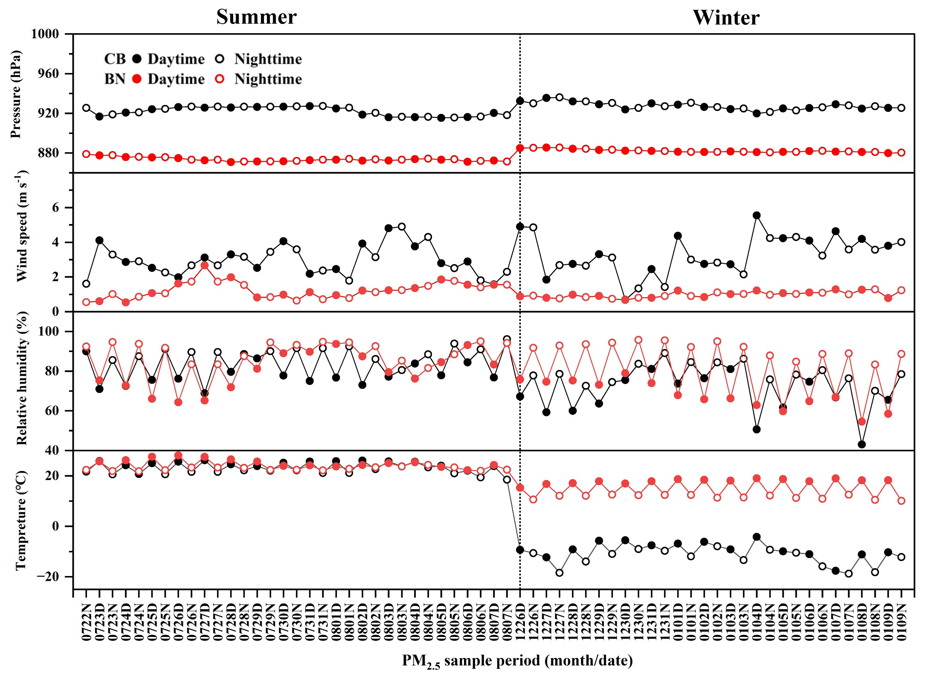 Meteorological parameters, including temperature, relative humidity, and wind speed at CB and BN, were from the Xihe Energy Big Data Platform (https://xihe-energy.com/#geo, last access: 31 July 2025). Seasonal and diurnal variations in the planetary boundary layer height were reported by Wu et al. (2024). To analyze air mass transport patterns, 72 h backward trajectories arriving at CB and BN at an altitude of 300, 500, and 1000 m above the ground level were calculated employing the Hybrid Single Particle Lagrangian Integrated Trajectory (HYSPLIT) model from the National Oceanic and Atmospheric Administration (https://www.ready.noaa.gov/index.php, last access: 1 October 2025).