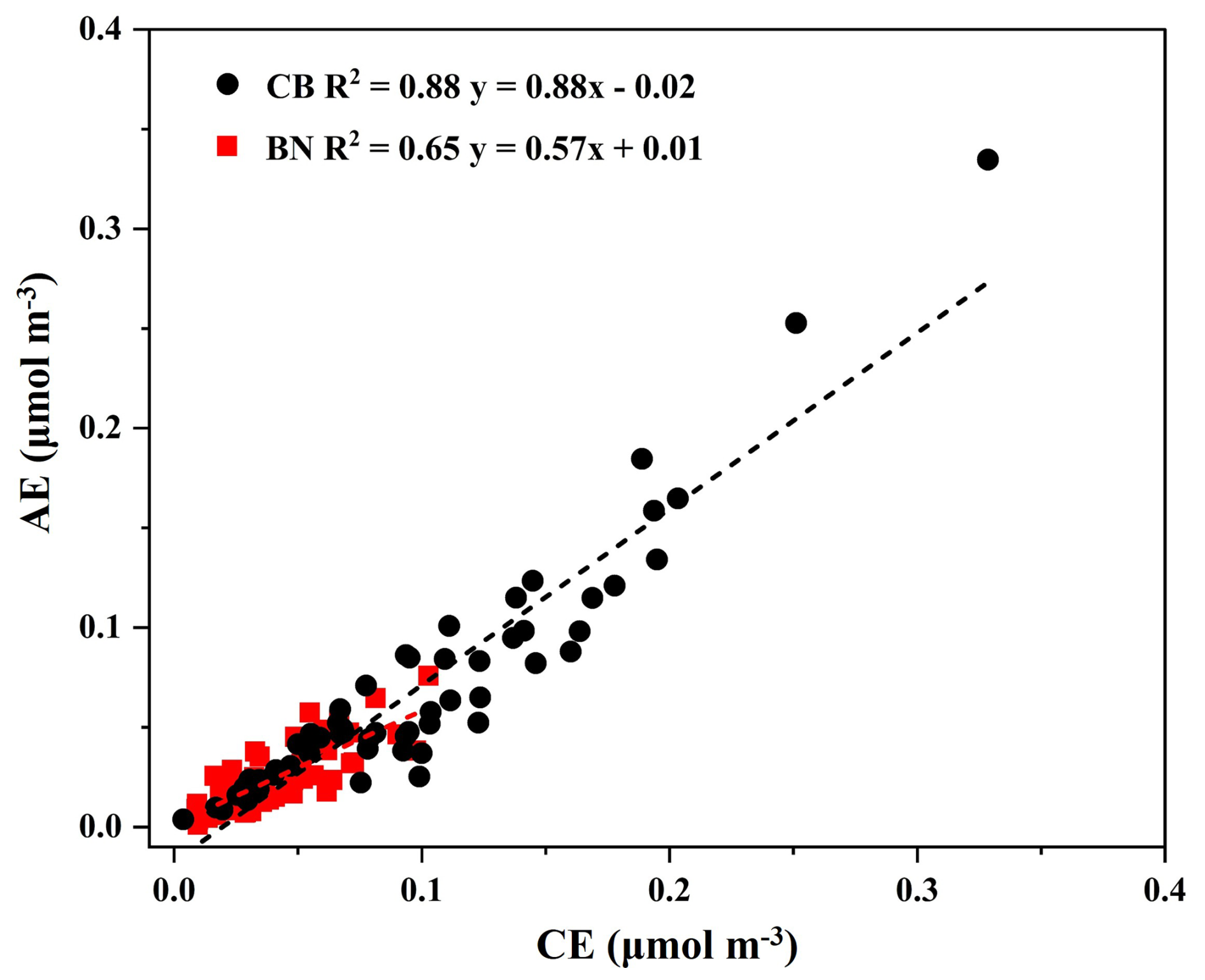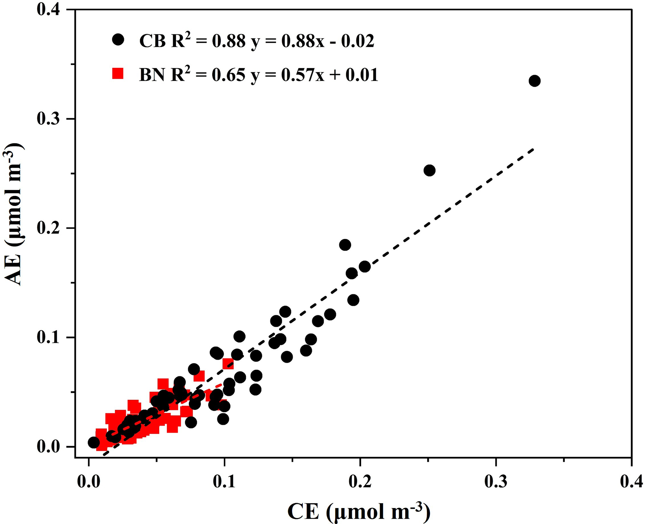 If the CE is greater than the AE, PM2.5 is alkaline, and vice versa. Average annual equivalent ratios of total cations (Na+, , K+, Mg2+ and Ca2+) to anions (Cl−, and ) were 1.62 ± 0.53 at CB and 1.92 ± 0.80 at BN, indicating that the aerosols at these two sites are alkaline. The high ratio of CEAE might be due to the enhanced NH3 emission caused by high temperature and agricultural activities (Qiao et al., 2019). It also should be noted that the excessive cations at both sites might be related to unmeasured anions like oxalate. Furthermore, soluble organic acid ions might also be the cause of the anion deficits at CB and BN. A more comprehensive investigation of this matter will be conducted in future research initiatives.