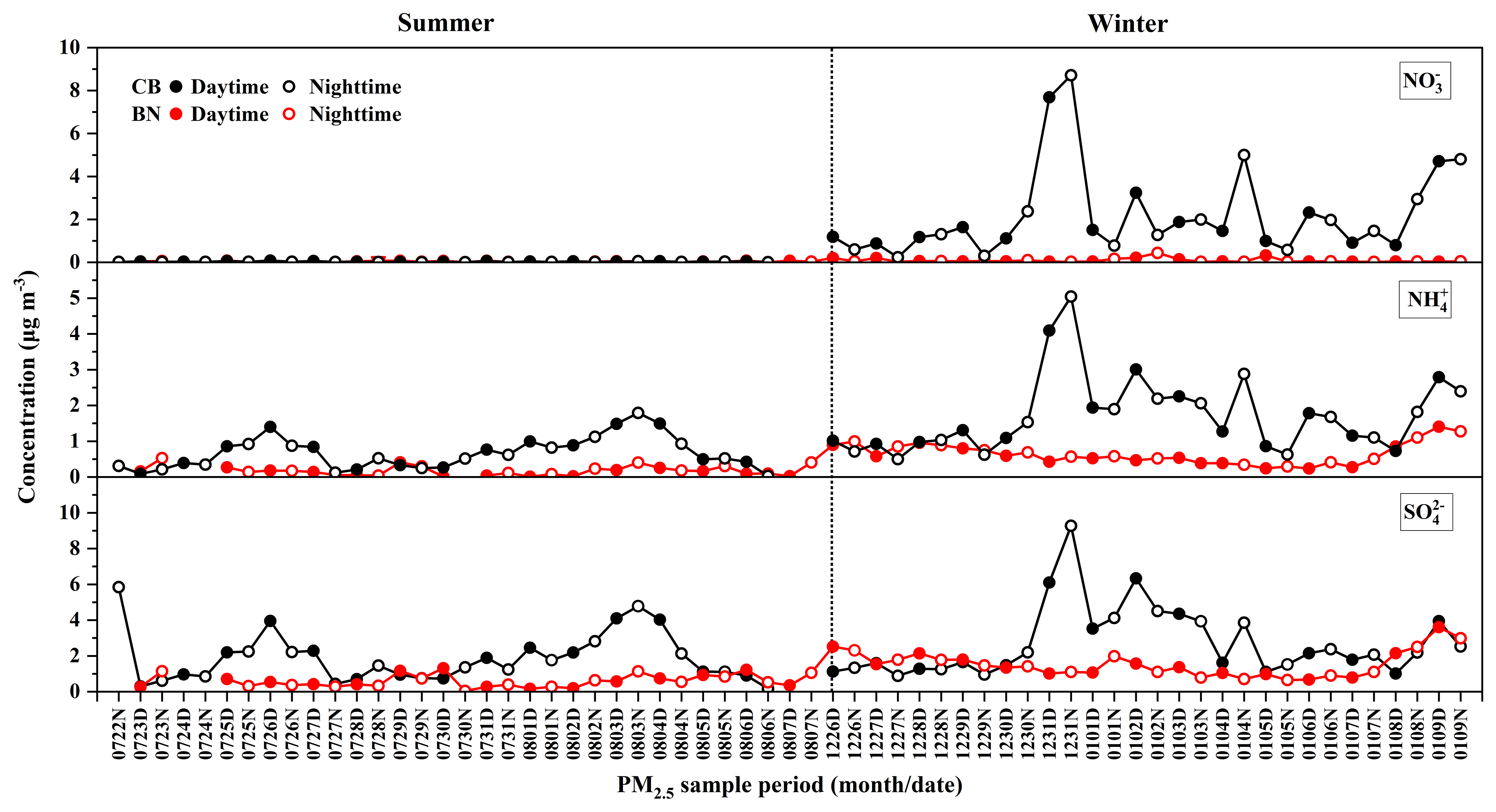 Figure 5 summarizes the concentrations and percentage contributions of various water-soluble ionic components. The contribution of to total ions at BN was very small in both summer (3 %) and winter (3 %), which may be attributed to the removal effect of wet deposition on nitrate particles due to the hot and humid climate throughout the year. However, the lower temperature environment (<15 °C) in winter might facilitated the transformation of gaseous nitric (HNO3) acid to particulate (NH4NO3), thereby potentially increasing the concentration of particulate . On the other hand, anthropogenic activities such as winter heating might emit more NOx, which, after undergoing a sequence of chemical reactions in the atmosphere, were converted into . Therefore, the contribution of (28 %) in winter at CB was relatively high.
