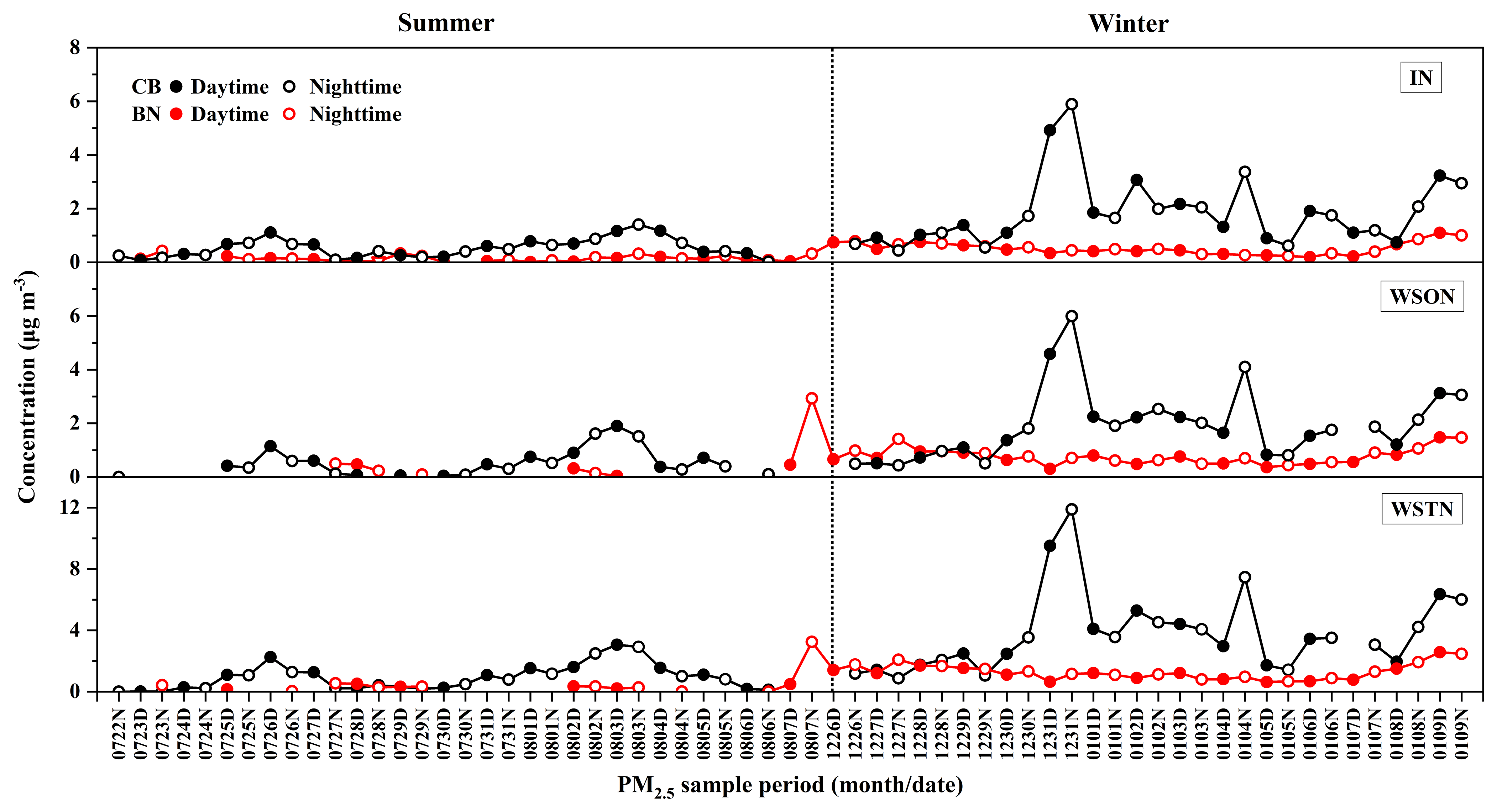 Figure 9Seasonal and diurnal variations of collected form CB and BN during the campaign. The S and W represent summer and winter, respectively.