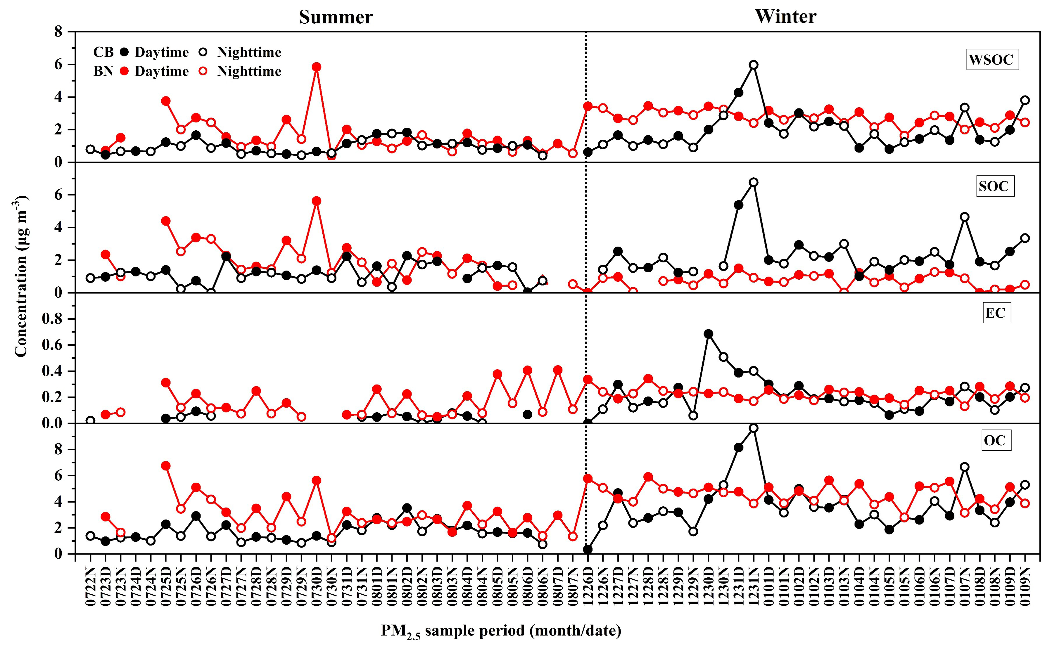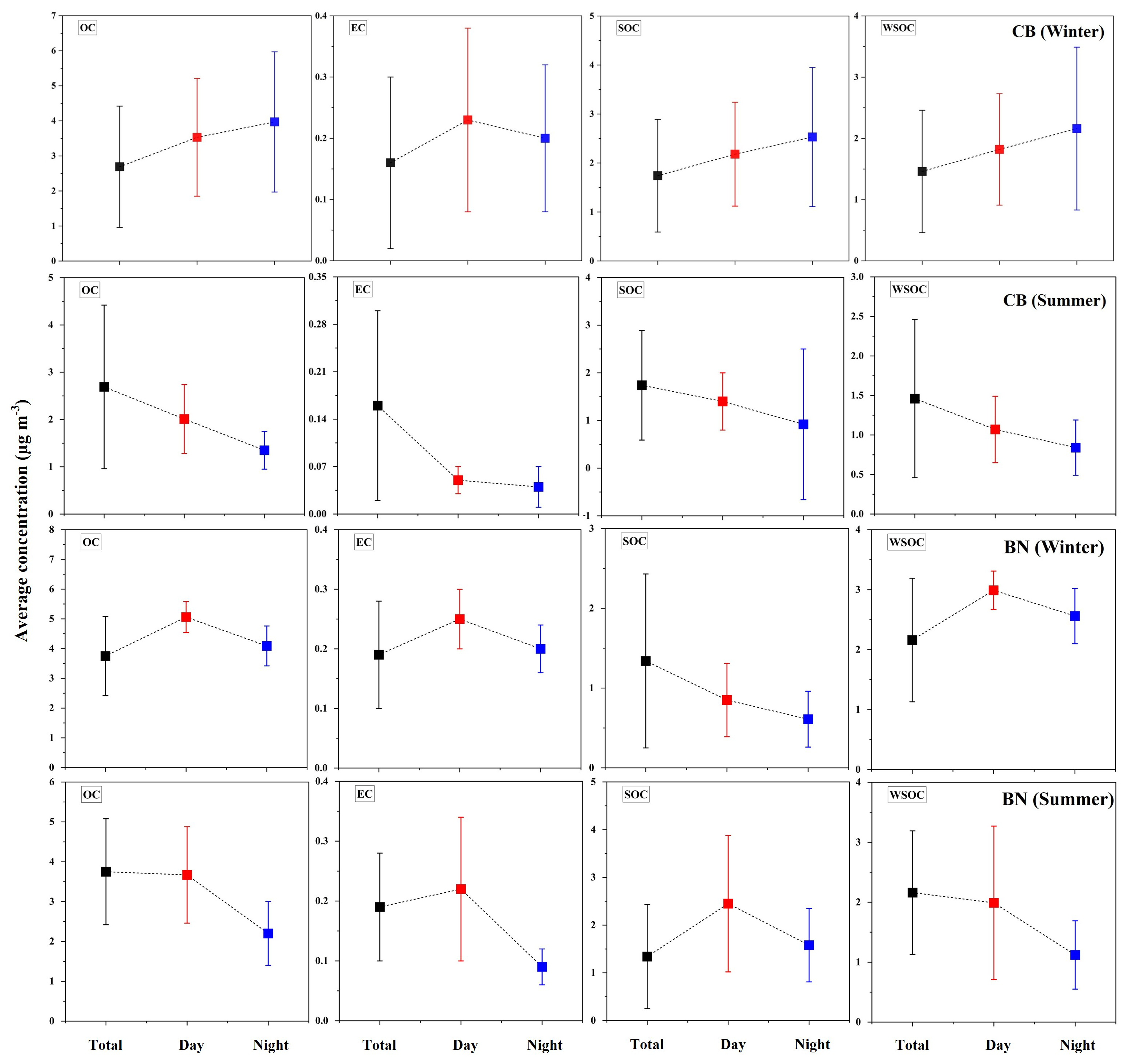 The concentrations of OC, SOC and WSOC were higher during the daytime than at nighttime at CB and BN (Fig. 8). The intense sunlight and high temperatures prevalent in the local region might have facilitated the enhanced formation of SOC during the summer. However, EC displayed no significant diurnal variation at CB. As shown in Fig. 7, OC, SOC and WSOC at CB in winter showed similar diurnal trends, suggesting that they could share similar/same origins and formation processes. Elevated concentrations of carbonaceous components at CB on 31 December 2023 was observed, which could be attributed to local fireworks and firecracker celebrations in advance of the New Year's Eve. We also noticed an increase in the concentrations of OC, SOC, and WSOC in the daytime on 30 July and 25 July 2023 at BN, which might be related to local biomass burning events.