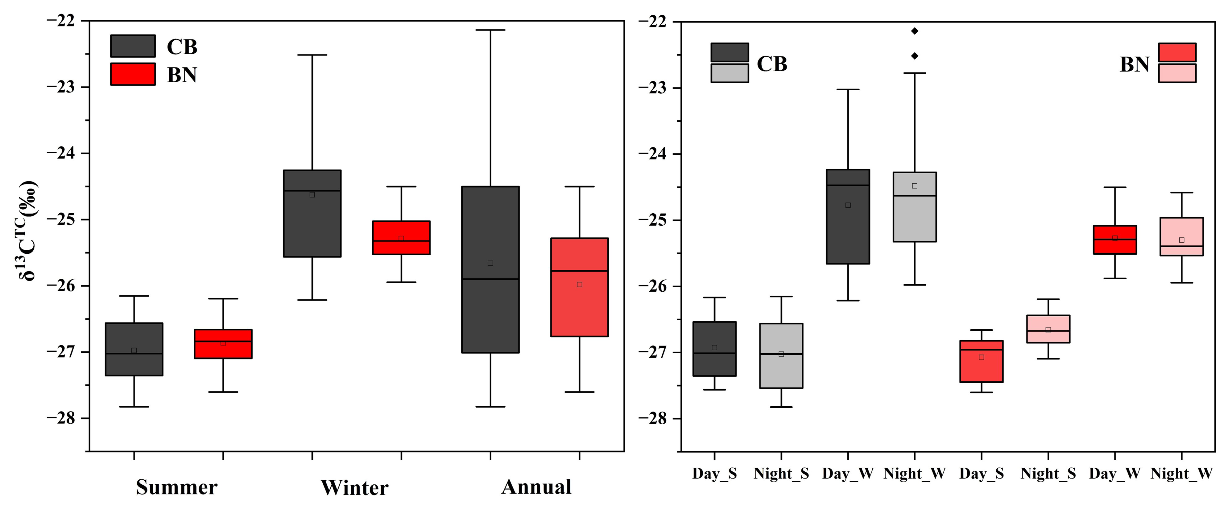 The diurnal variation of in the aerosols of CB and BN was not very significant, except for a slight difference in winter at CB and in summer at BN, where the average values were −24.8 ‰ ± 1.0 ‰ and −27.1 ‰ ± 0.3 ‰ at the daytime, −24.5 ‰ ± 1.2 ‰ and −26.7 ‰ ± 0.3 ‰ at the nighttime, respectively. Their values were more positive at the nighttime. This might be associated with stronger plant emissions/biological activity during the daytime, and higher humidity and lower temperatures at nighttime that favored gas-to-particle transformation of organic compounds (Ren et al., 2019).