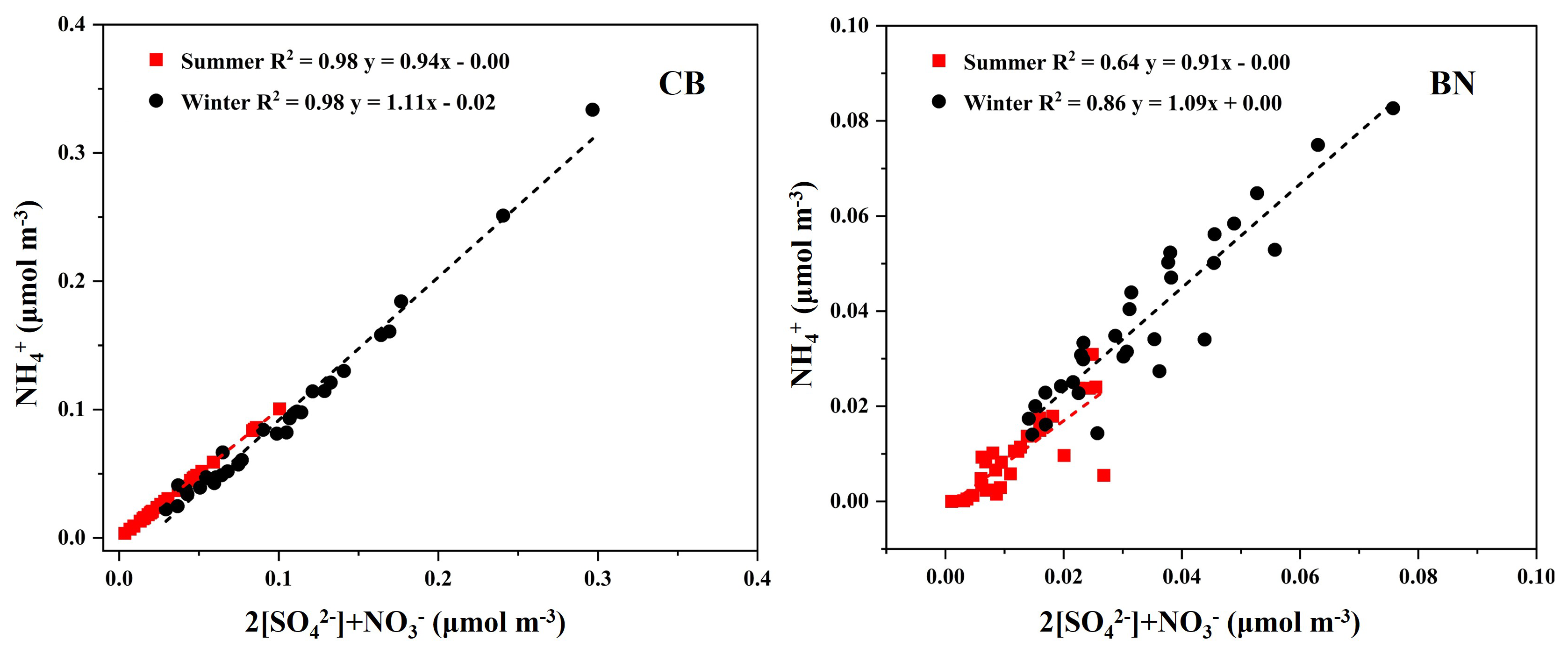 The molar ratio of in aerosols can be used to determine the acidity of aerosols and the combination form of the main secondary inorganic ions (Pathak et al., 2004; Lyu et al., 2015). When , the aerosols are almost completely neutralized although ammonium nitrate (NH4NO3) is present. If , the concentration of free acid in the particulate phase is relatively high, and there is almost no NH4NO3 present. The average ratio of at CB was 1.74 (summer: 0.97; winter: 2.54), whereas that at BN was 0.84 (summer: 0.44; winter: 1.25), suggesting an excess of ammonium existed in the aerosols at both sites, and nearly no NH4NO3 was present at BN. In fact, the concentrations of and Cl− were extremely low at both sites in summer, so the main form of were (NH4)2SO4 and NH4HSO4. This resulted from elevated summer temperatures enhancing the breakdown of particulate NH4NO3 into gaseous NH3 and HNO3. was strongly correlated with at both sites, particularly in winter, which further demonstrates that (NH4)2SO4 and NH4HSO4 were their primary forms. However, a favorable correlation existed between and at CB, and the fitting slope of ammonium and in winter was greater than 1 (Fig. 11), indicating that there was an adequate amount of NH3 in the atmosphere to undergo neutralization reactions with H2SO4 and HNO3, thereby forming ammonium NH4NO3 and (NH4)2SO4.