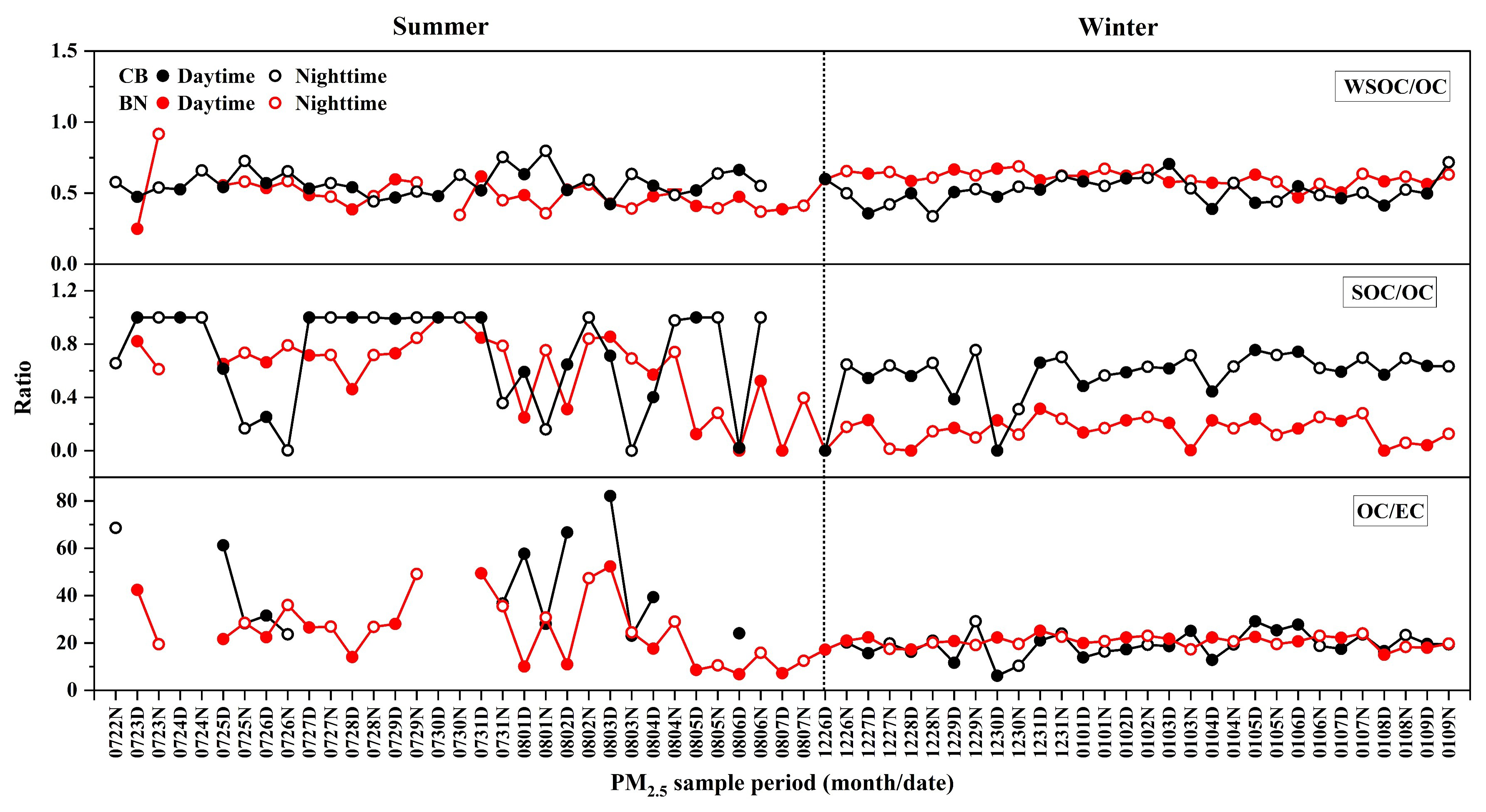 where (OC EC)min is the minimum value of the mass concentration ratio of OC EC produced from primary emissions. Considering the differences in meteorological conditions and pollution source emissions at each sampling sites in different seasons, the average value of three (OC EC)min monitored in different seasons at the sampling sites was applied to estimate the SOC. The minimum OC EC ratios of 23.59, 7.15 in CB and 7.57, 17.26 in BN during the summer and winter, respectively.
