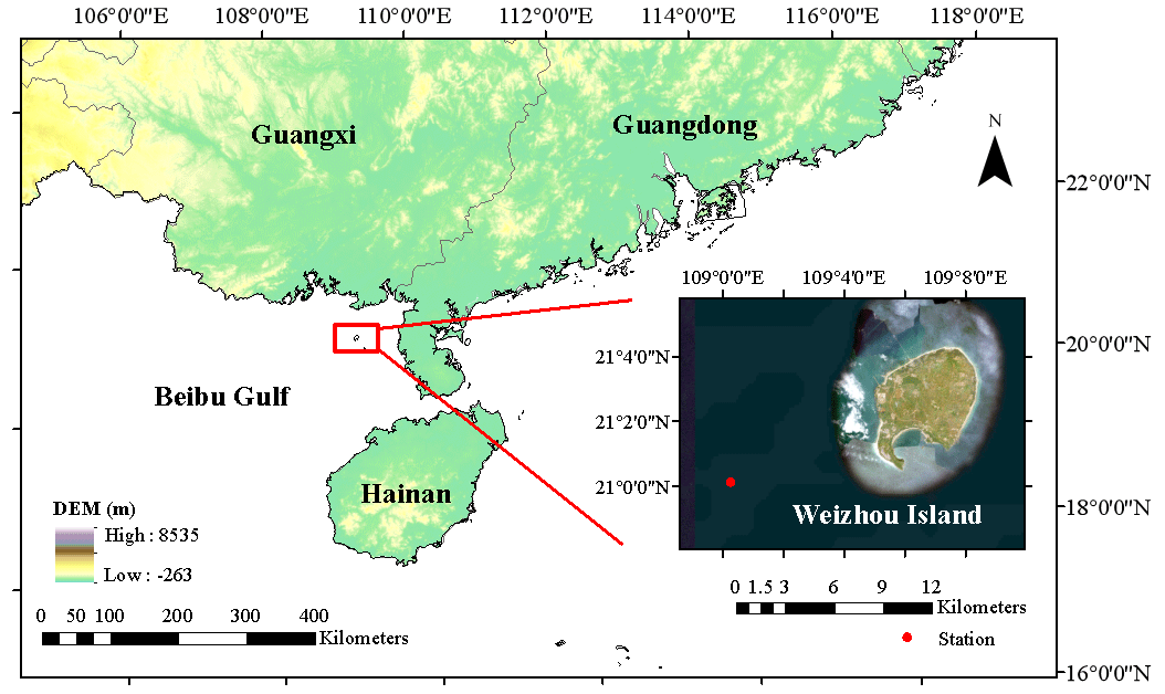 Figure 1The research area is located in the waters of Weizhou Island in Beibu Gulf, southern China. The red dots in the figure indicate the location of the Weizhou Marine Environmental Monitoring Station (21.0017° N, 109.0117° E). Eight distinct sets of monitoring data were collected from this monitoring station.