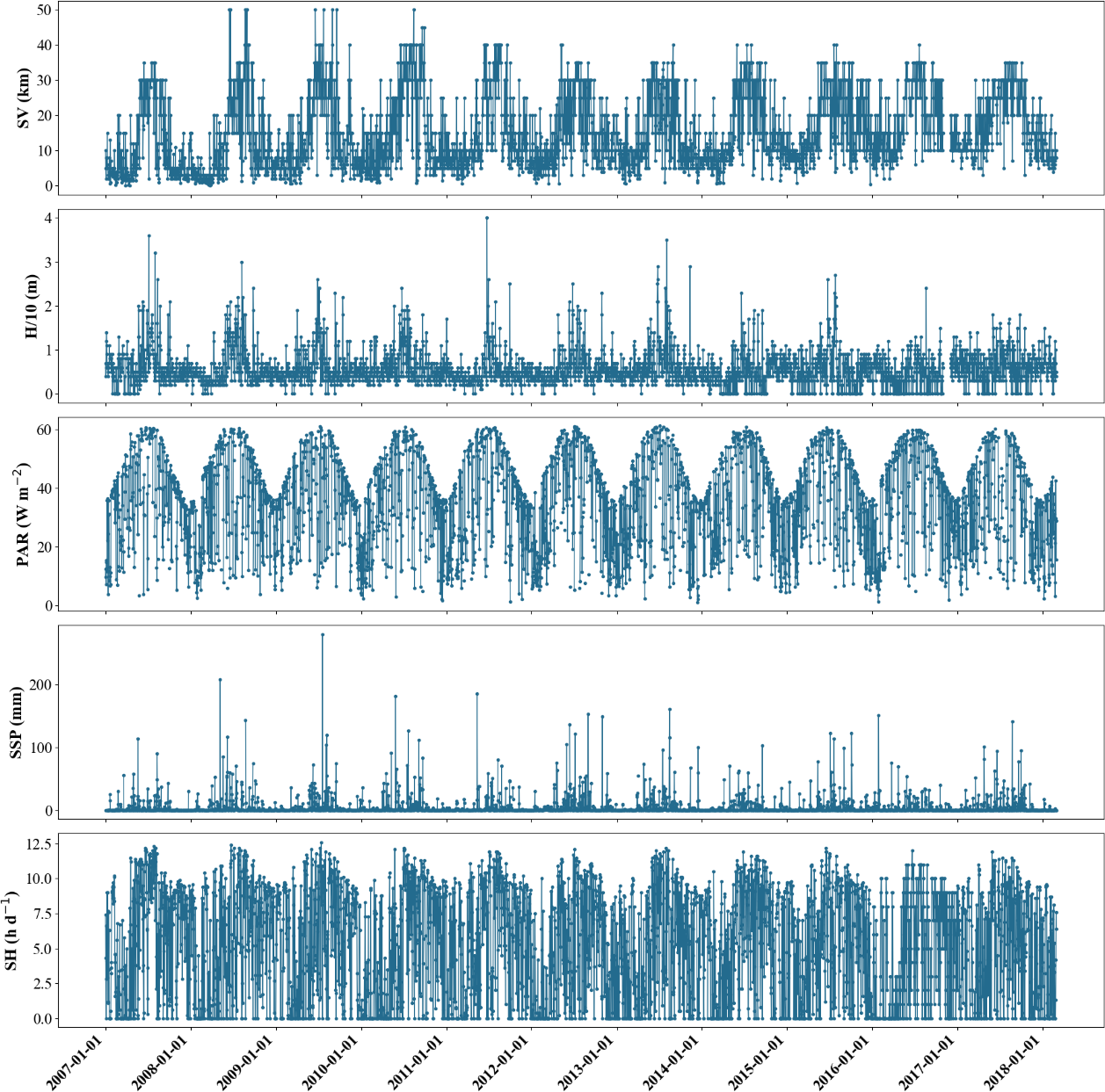 Due to factors such as equipment malfunctions and adverse weather conditions, some data for the 11 variables were incomplete, which may affect the accuracy of the model, especially when capturing extreme events. To gain a deeper understanding of the data structure and address these gaps, we conducted an analysis of the missing data and identified five variables with missing entries (Table 2): SV, , SSP, PAR, and SHs. These missing data points are primarily due to random occurrences such as satellite equipment malfunctions and severe weather conditions, which disrupt data acquisition. Since these events are sporadic and not tied to any specific frequency, only the total number of missing values has been recorded. Subsequently, we visualized these five variables in a chronological sequence, with the findings depicted in Fig. 2. Distinct from day length, which is computable based on location and date, SHs indeed refer to the daily measured duration of sunlight reaching the Earth's surface. The variability and instances of zero values observed in Fig. 2 (bottom panel) and mentioned in Table 2 reflect real-world fluctuations due to weather conditions – on overcast or rainy days, actual sunshine hours recorded can indeed drop to zero. These data are collected on a daily basis, hence the seemingly sporadic pattern rather than a smooth temporal variation expected for constant day length calculations. The analysis revealed a marked periodicity in these variables, prompting us to employ time series interpolation as our method of choice for data imputation. The efficacy of this approach is evidenced in Table 3, which presents the statistical indicators of the data both pre- and post-interpolation. Notably, while the post-interpolation data retain a close resemblance to the original data in terms of statistical indicators, it is important to acknowledge that interpolated data are not independent observations. The validity of the interpolation method, therefore, depends on the specific application and context. In this study, interpolation was used to address missing variables, and we ensured that the statistical properties of the original data were preserved to the greatest extent possible. This approach allows us to maintain the integrity of our analyses while recognizing the inherent limitations of using interpolated data.