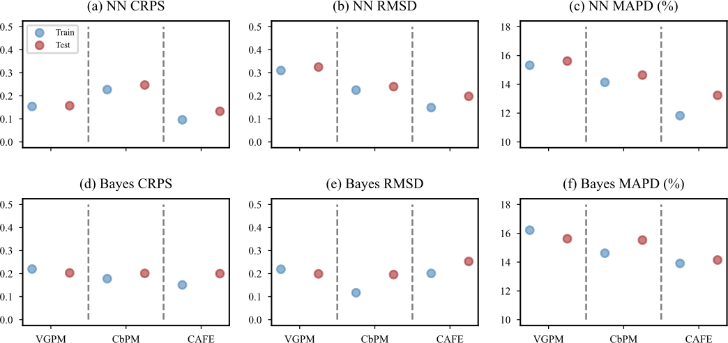 It can be observed from Fig. 5a and d that the CRPS values of both the NN model and the Bayes model are similar. When VGPM is used as a prediction target, the performance of the models is closest between the training set and test set, followed by CbPM. However, CAFE has the lowest CRPS value among all three models, with its test set's value slightly larger than that of its training set. The lower CRPS value for CAFE, compared to VGPM and CbPM, may stem from the fact that its probability distribution aligns more closely with the prediction of models in terms of both shape and central tendency, since CRPS evaluates the full probability distribution, incorporating factors such as skewness and kurtosis in addition to variance. In the case of CAFE, the probabilistic structure of its predictions may exhibit better congruence with the observed cumulative distribution function (CDF) (Sect. 3.2.1), particularly in regions with higher data density. This enhanced alignment could compensate for its slightly larger variance compared to CbPM, thereby resulting in a lower CRPS value. Additionally, the design and parameterization of the CAFE model may inherently emphasize features that lead to improved probabilistic predictions, which warrants further investigation.