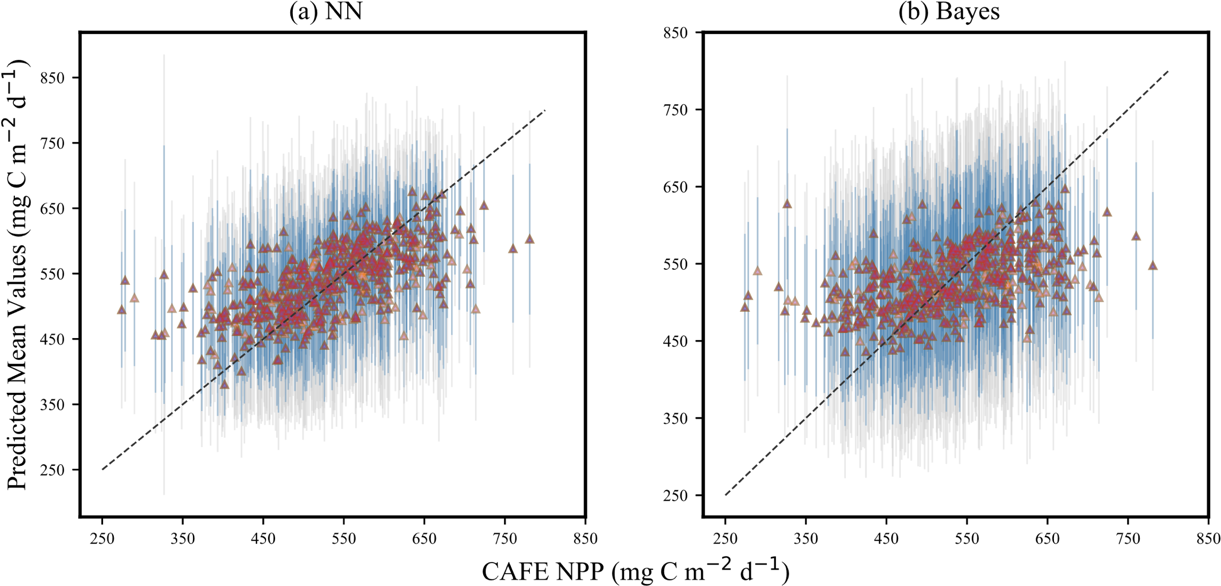 When CAFE is less than 450 mg C m−2 d−1, both models tend to overestimate the actual NPP value. This phenomenon becomes more pronounced when CAFE is less than 350 mg C m−2 d−1. In contrast, a certain linear relationship between the true value and predicted mean value emerges within a range of 450–600 mg C m−2 d−1. Most of the predicted mean values are distributed around the 1:1 line in this range, indicating higher accuracy by these models. However, when CAFE exceeds 600 mg C m−2 d−1, it is observed that both models tend to underestimate actual NPP values. This phenomenon may be attributed to an imbalance in sample data distribution within different intervals of CAFE. The majority of data points are concentrated in a narrow range (350–600 mg C m−2 d−1), while data points in other intervals are scarce. This inadequacy makes it difficult for model training to capture its distribution law accurately and leads to increased prediction uncertainty within these ranges.