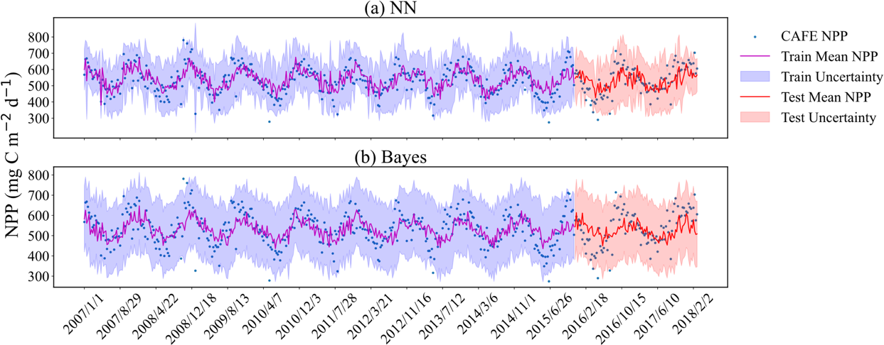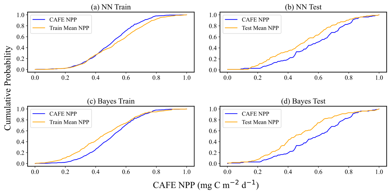 Therefore, among the three NPP datasets, CAFE was selected as the primary prediction target for subsequent analysis. This decision was motivated by two factors: (1) previous studies have shown that for other NPP models analyzed for the same dataset, the CAFE model explains the most variance, has the lowest model bias, and also reproduces the magnitude and seasonality of field-measured NPP better than other satellite remote sensing models (Silsbe et al., 2016), and (2) both probabilistic prediction models (NN and Bayesian) have demonstrated the ability to emulate CAFE output with high accuracy and reliability. While this does not imply that CAFE perfectly represents true NPP, its suitability for capturing patterns in the study area supports its use as the prediction target in this work.