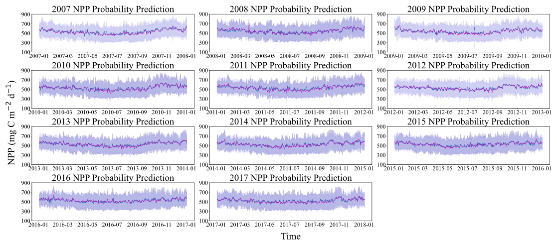 Figure 11Time series plots of probabilistic NPP predictions in Weizhou Island (2007–2017). The light purple shading indicates the 95 % confidence interval of the Bayesian model, while the dark purple shading represents the 95 % confidence interval of the neural network model. The green lines show the mean prediction values from the neural network model, and the gray lines depict the mean prediction values from the Bayesian model.