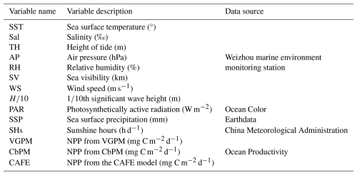 The dataset of this study encompasses eight distinct sets of monitoring data spanning January 2007 to February 2018, amassing a total of 4077 d. These data were procured from the Weizhou Marine Environmental Monitoring Station (21.0017° N, 109.0117° E) and encompass a spectrum of variables: sea surface temperature (SST), salinity (Sal), tide height (TH), air pressure (AP), relative humidity (RH), sea visibility (SV), wind speed (WS), and th significant wave height (). Additionally, photosynthetically active radiation (PAR) was retrieved from NASA's Ocean Color portal (https://oceancolor.gsfc.nasa.gov/, last access: 19 May 2023), sea surface precipitation (SSP) was sourced from NASA Earth observation data (https://www.earthdata.nasa.gov/, last access: 10 May 2023), and sunshine hours (SHs) were sourced from the China Meteorological Administration (https://data.cma.cn/, last access: 10 May 2023). These data were aggregated to constitute a comprehensive dataset encompassing 11 variables, serving as the input features for the models. Phytoplankton, the primary source of NPP, is directly influenced by variables such as SST, Par, and SHs, which are critical to its photosynthetic processes. Additionally, other variables have significant indirect effects on phytoplankton growth. Sal, for example, influences the community structure of phytoplankton (Braarud, 1951). Variables such as TH, , and WS indirectly affect phytoplankton dynamics by modulating water column mixing and the vertical distribution of nutrients. AP, RH, and SV also indirectly impact phytoplankton photosynthetic activity by altering environmental conditions. For the analysis of three NPP algorithms – namely VGPM, CbPM, and CAFE – we utilized their output datasets, which were obtained at an 8 d temporal resolution from the Ocean Productivity website (http://orca.science.oregonstate.edu/1080.by.2160.monthly.hdf.vgpm.m.chl.m.sst.php, last access: 17 April 2023; http://orca.science.oregonstate.edu/1080.by.2160.monthly.hdf.cbpm2.m.php, last access: 27 April 2023; http://orca.science.oregonstate.edu/1080.by.2160.monthly.hdf.cafe.m.php, last access: 27 April 2023). These datasets represent the modeled NPP estimates produced by each algorithm over a cumulative duration of 514 d. The specific datasets utilized for this study are itemized in Table 1.