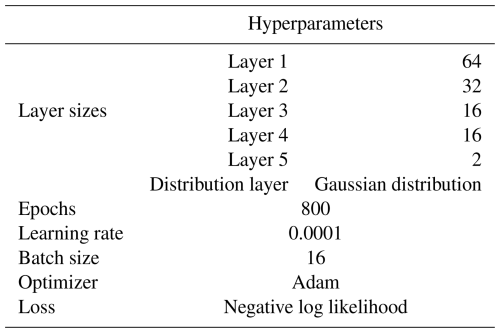 The dataset spans 4077 d, but due to the 8 d time interval of the downloaded NPP products, only 514 complete datasets are available for model training and performance evaluation. Given the limited amount of data, 80 % of the 514 sets are used for model training and parameter tuning, while the remaining 20 % are used for performance evaluation. In the neural network probabilistic prediction model, there are six layers, with two output nodes used to estimate the mean and standard deviation. The Gaussian distribution is employed in the distribution layer, and the loss function is the negative log-likelihood loss function. The detailed parameters of the neural network are presented in Table 4.